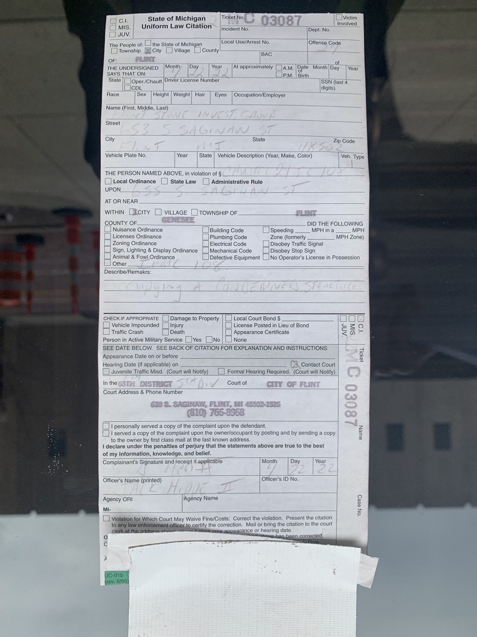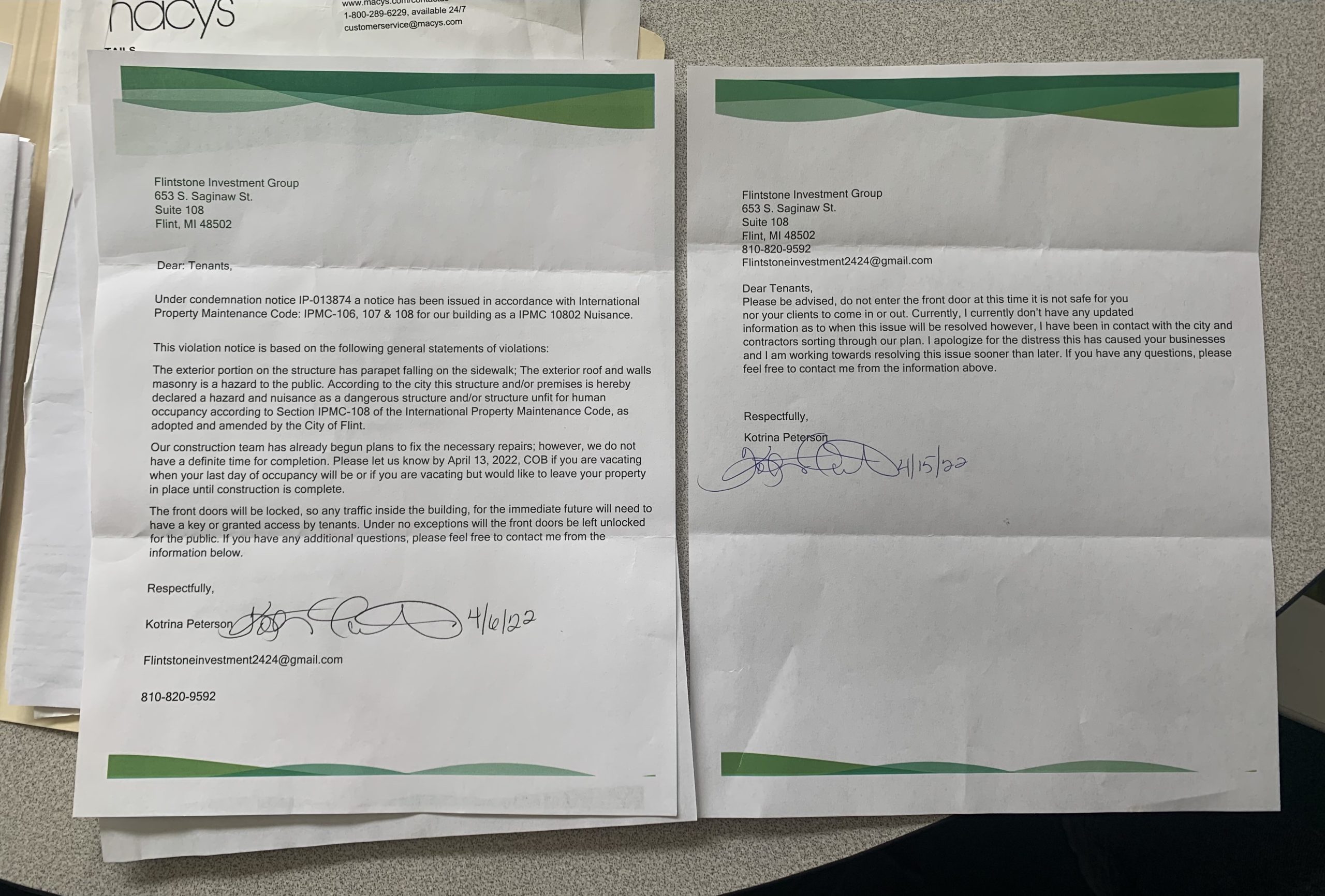 While the citation’s issuing officer did not respond to a request for further information by press time, documents obtained by Flint Beat indicate that the owner has been aware of the building’s status since at least April 6, when a letter was sent out to tenants by Kotrina Peterson, Vice President of Operations for Flintstone Investment Group Corp. and Mr. Peterson’s sister.