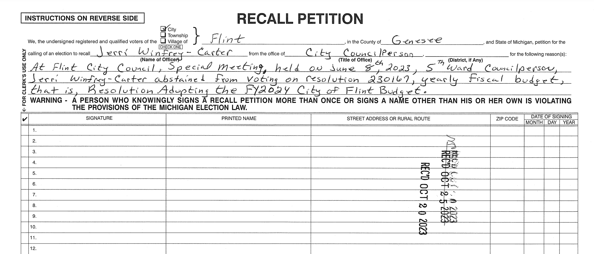 The petition cites Winfrey-Carter’s abstention from voting on “Resolution #230167, the yearly fiscal budget” at a special council meeting on June 8, 2023.