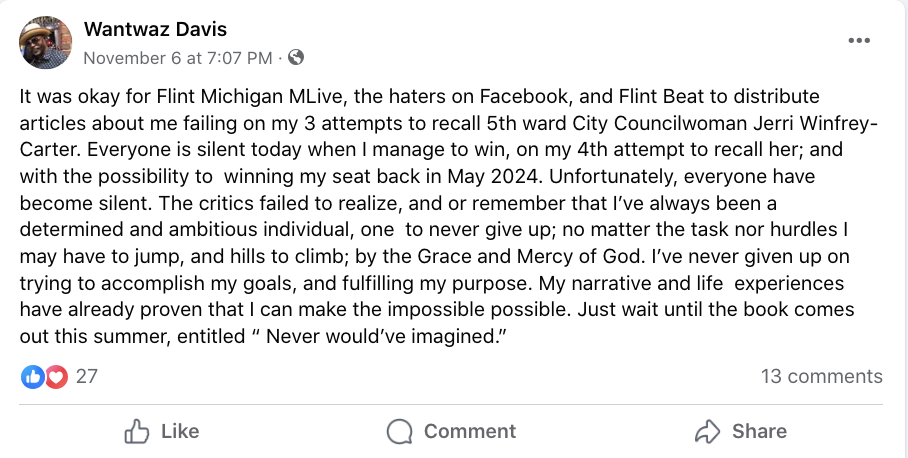 In the same post, he also called local news media outlets, including Flint Beat, “haters” for not covering the hearing.