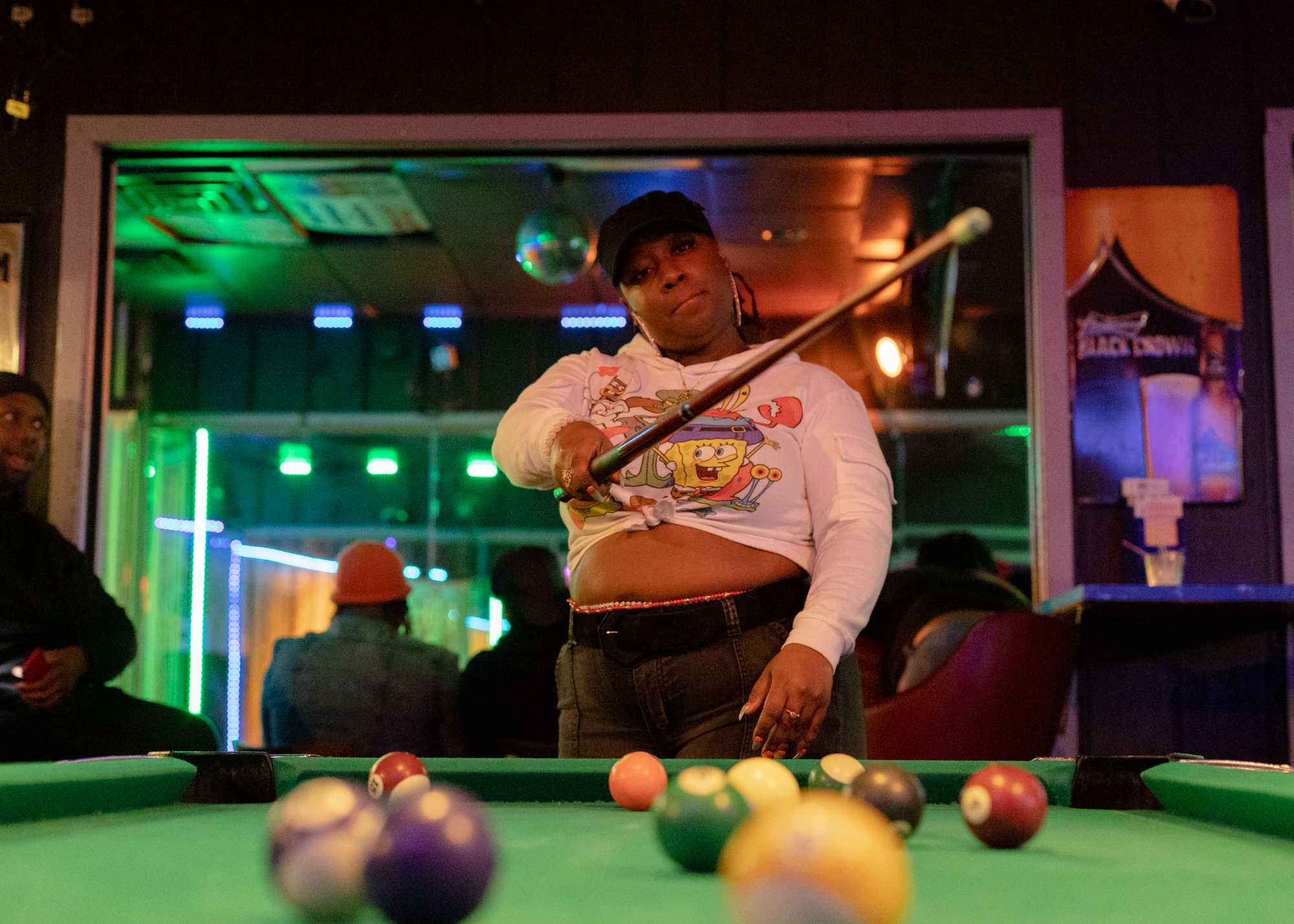 Buffie Johnson, 29, of Flint, Mich., lines up a shot during a game of pool at Rube’s Bar & Grill on April 7, 2022. (KT Kanazawich | Flint Beat)