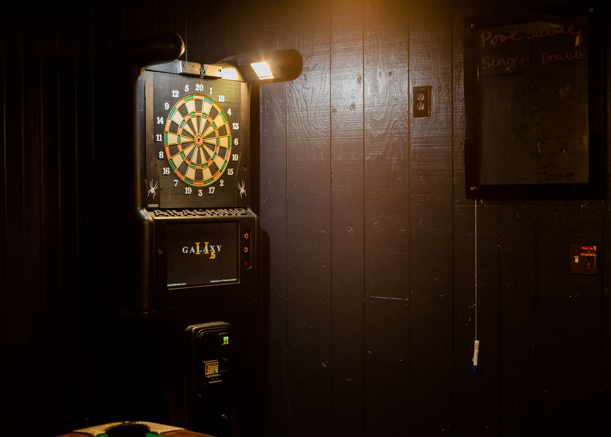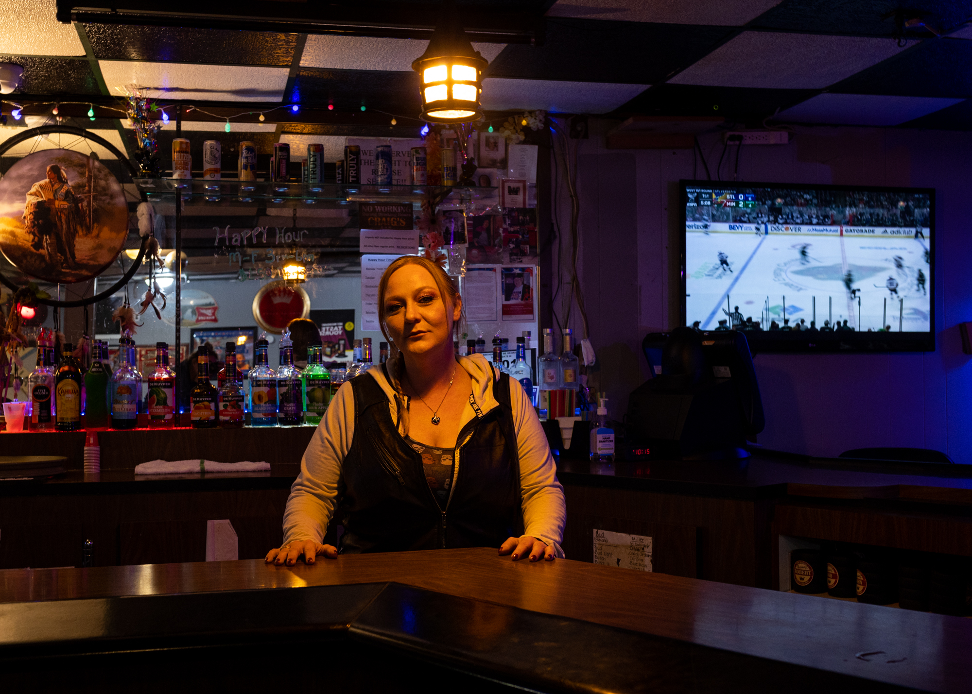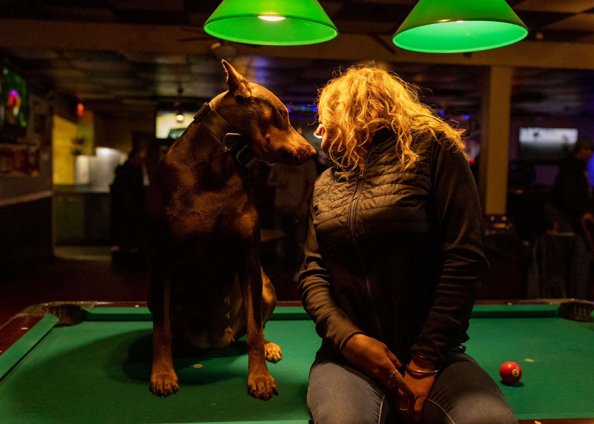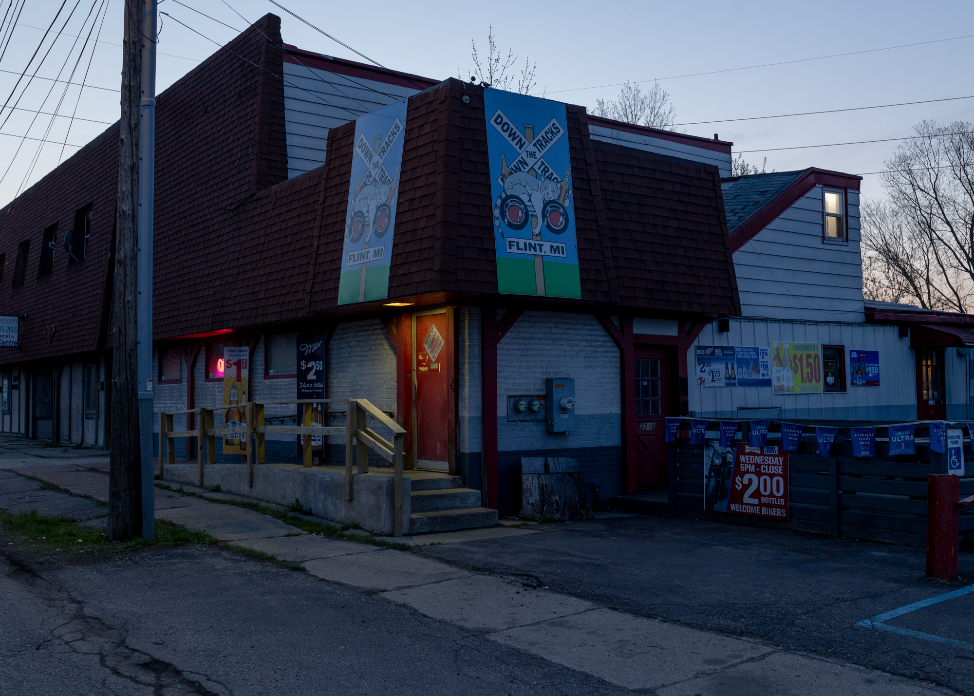 The sun sets behind Down the Tracks, a bar on Flint’s west side on May 4, 2022. (KT Kanazawich | Flint Beat)Bridget Rex, 33, of Flint, sits with her dog Echo on the pool table at Down the Tracks. Rex was previously the bar manager for three years but still comes to visit with Echo. (KT Kanazawich | Flint Beat)Bartender Randi Morrow, 40, of Flint, Mich. awaits customers at Down the Tracks on May 4, 2022. Morrow has been bartending there for about a year. (KT Kanazawich | Flint Beat)