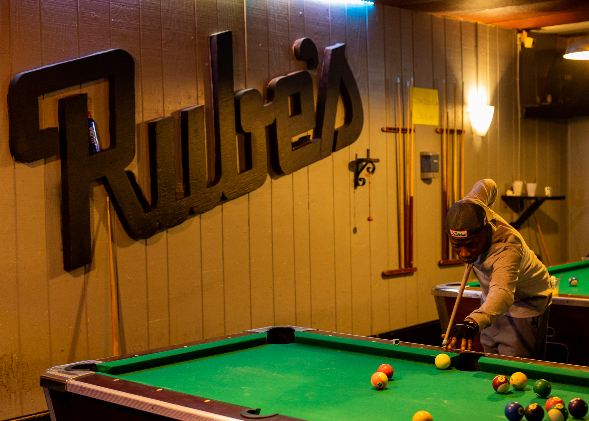 Dwayne Corder, 57, of Flint, Mich. shoots pool at Rube’s Bar & Grill on April 7, 2022. (KT Kanazawich | Flint Beat)