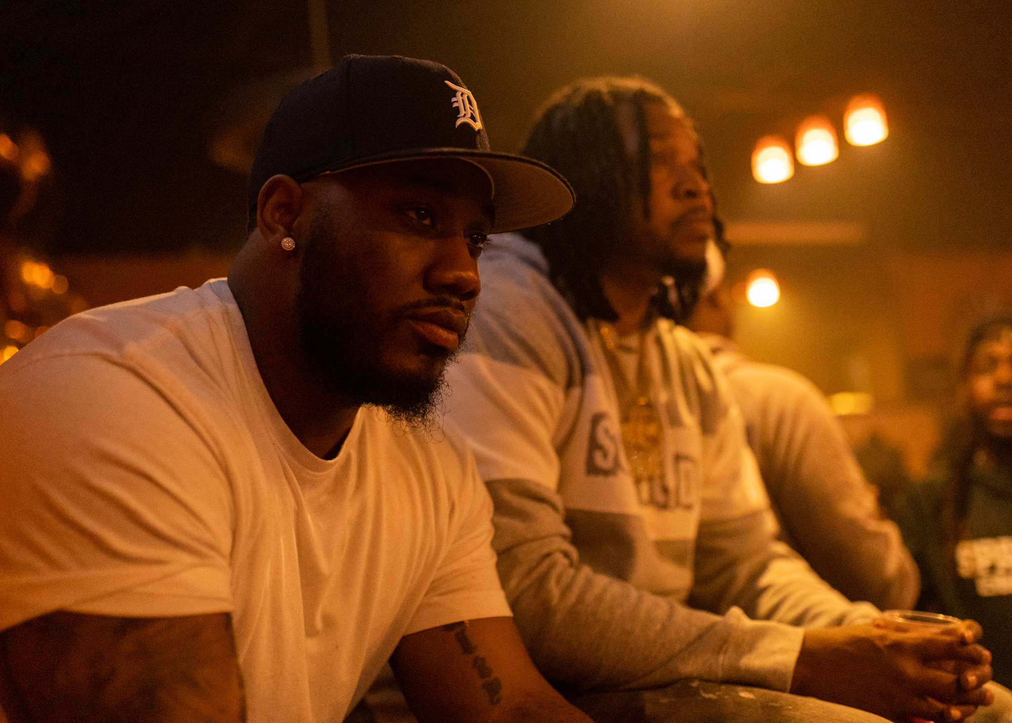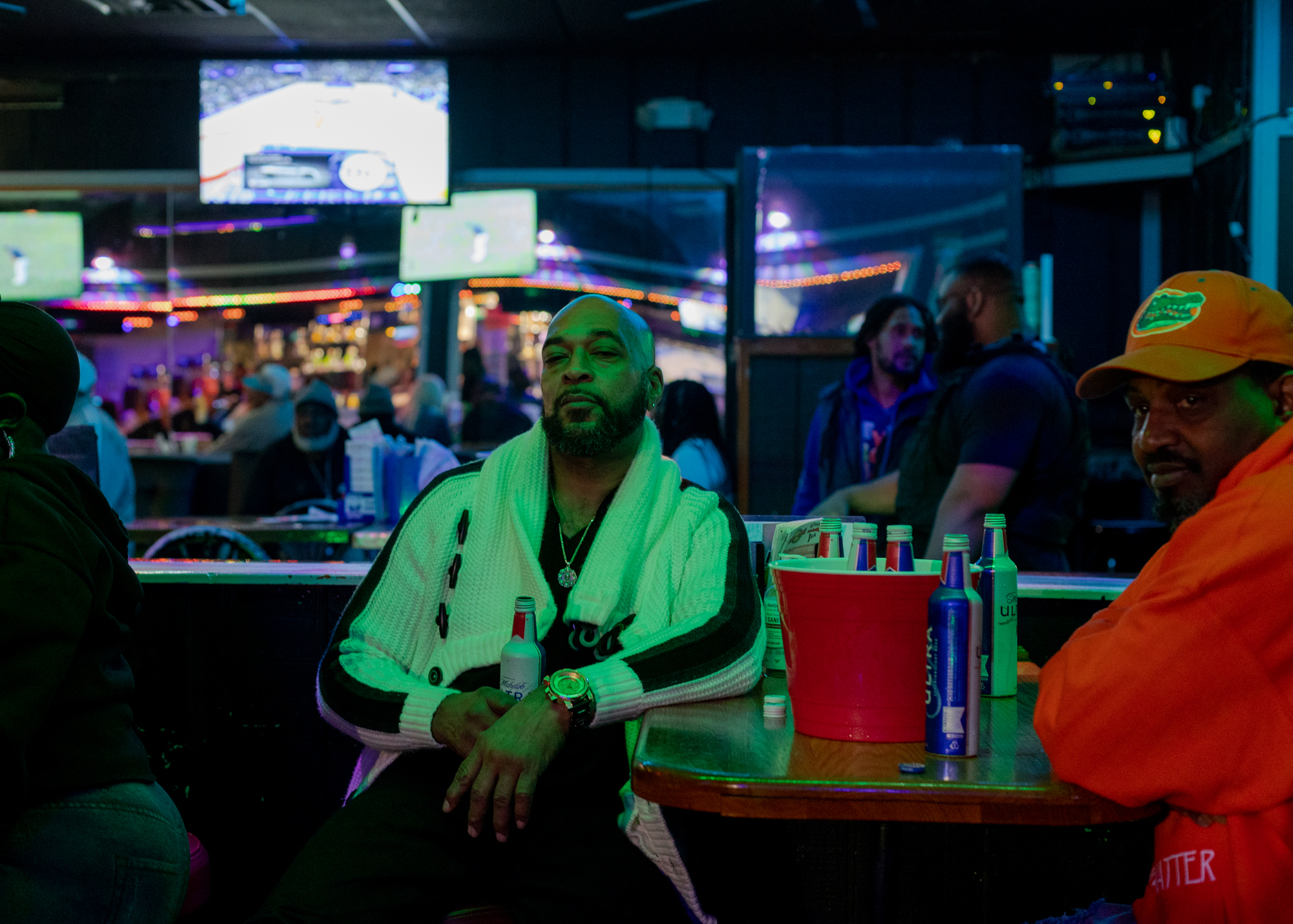 Deniro Johnson, of Flint, sits in a booth at the Vets Club on the south side of Flint, Mich. during the R&B Thursdays event on April 29, 2022. (KT Kanazawich | Flint Beat)