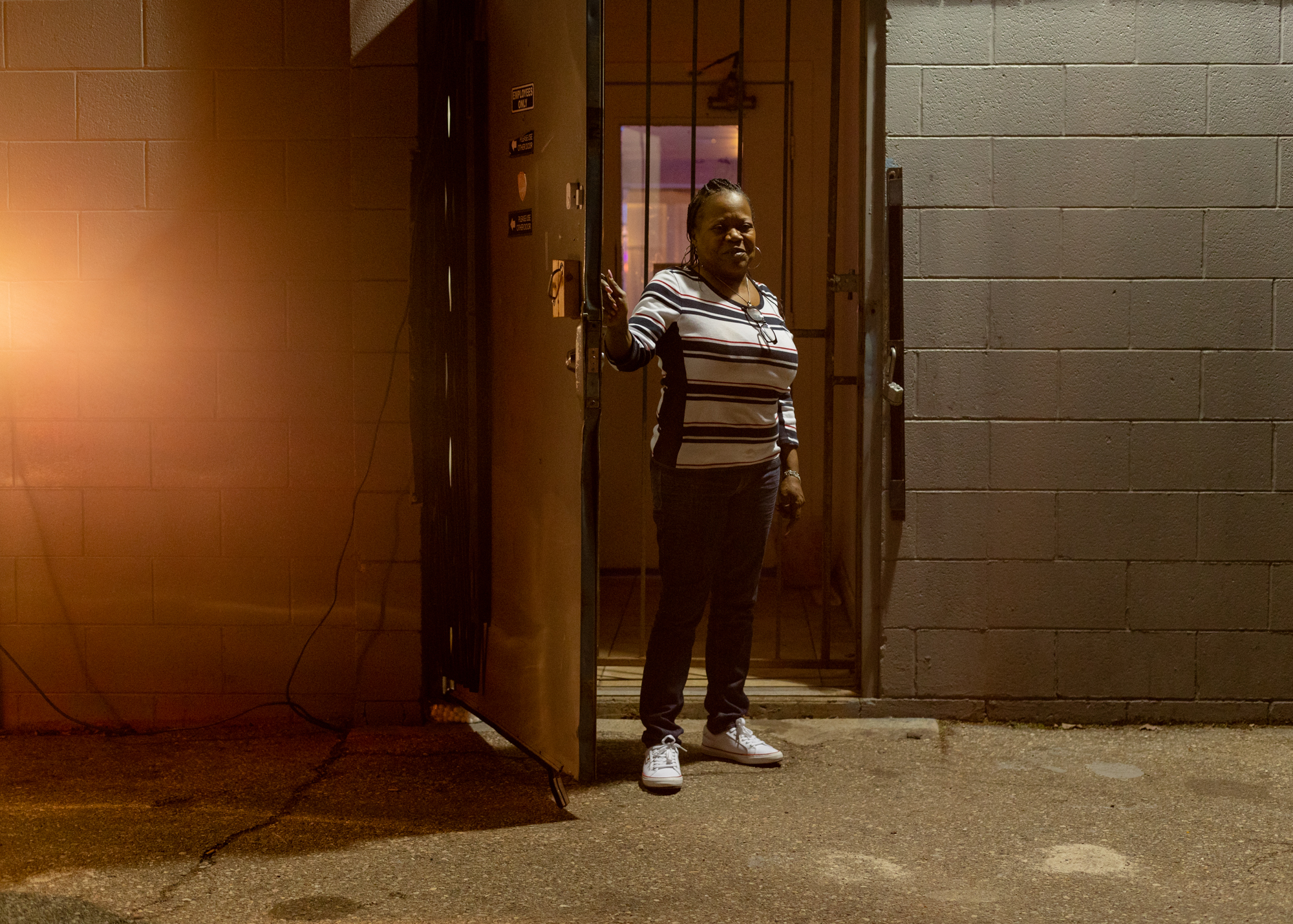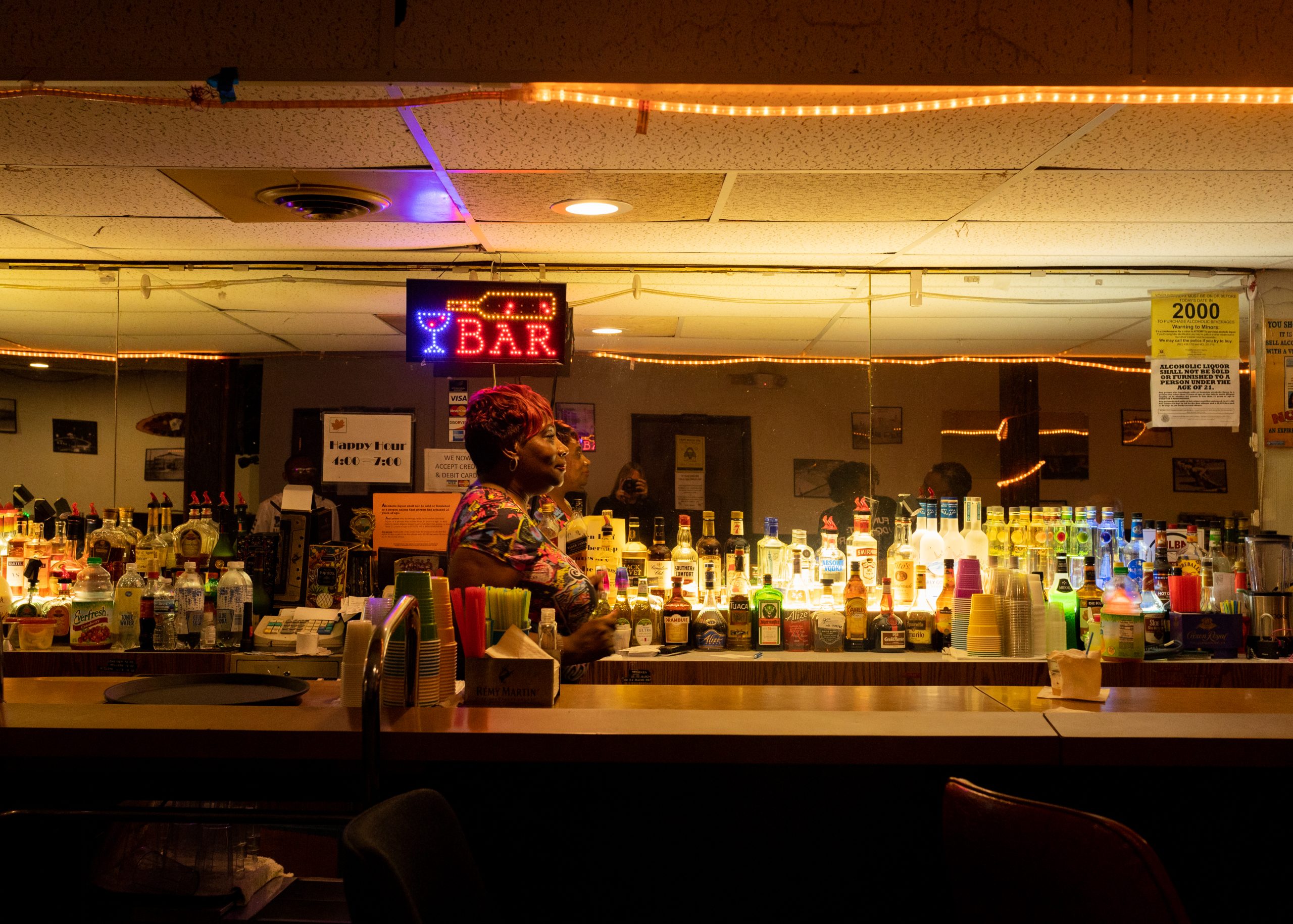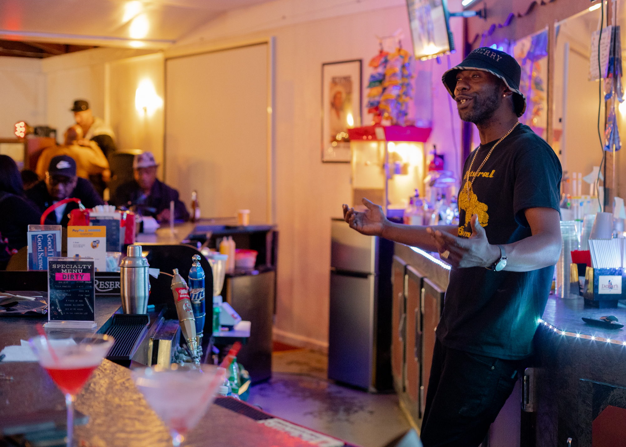 Montrell Cannon, 42, of Flint, bartends at The New Misty 50’s on the north side of Flint, Mich. on April 12, 2022. Cannon has been bartending there for about 7 months and says he loves serving the crowd that comes in. (KT Kanazawich | Flint Beat)