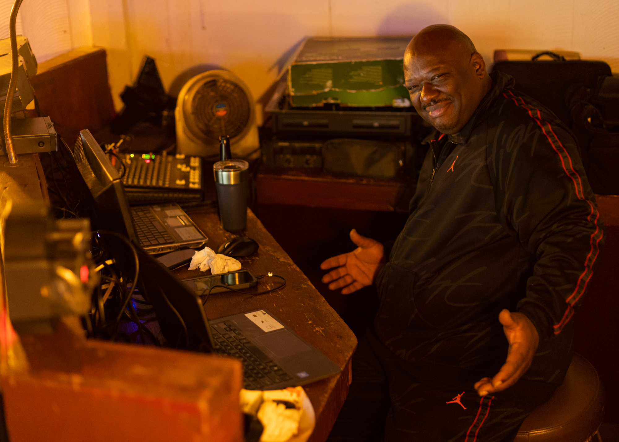 OJ Jackson, 51, of Flint, DJ’s at The New Misty 50’s on the north side of Flint, Mich. on April 12, 2022. (KT Kanazawich | Flint Beat)