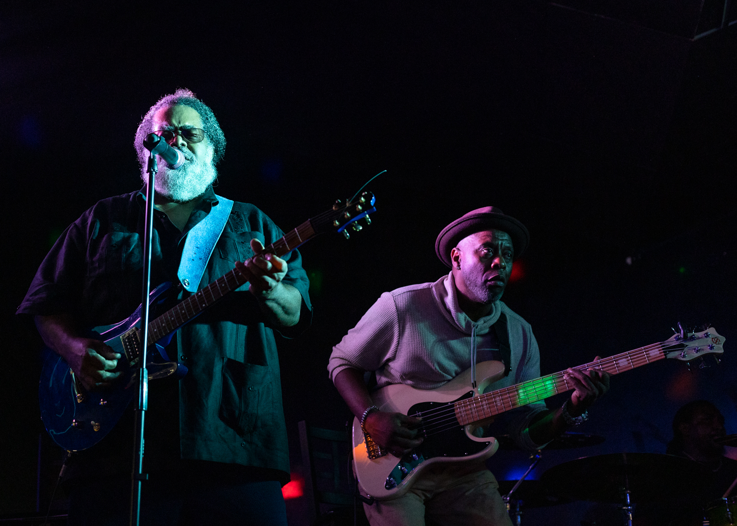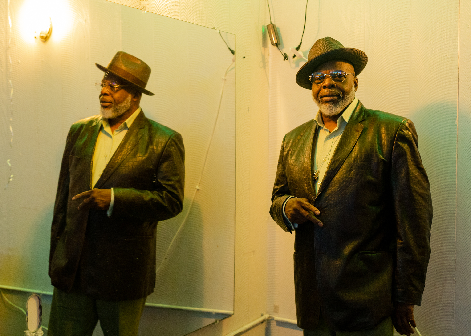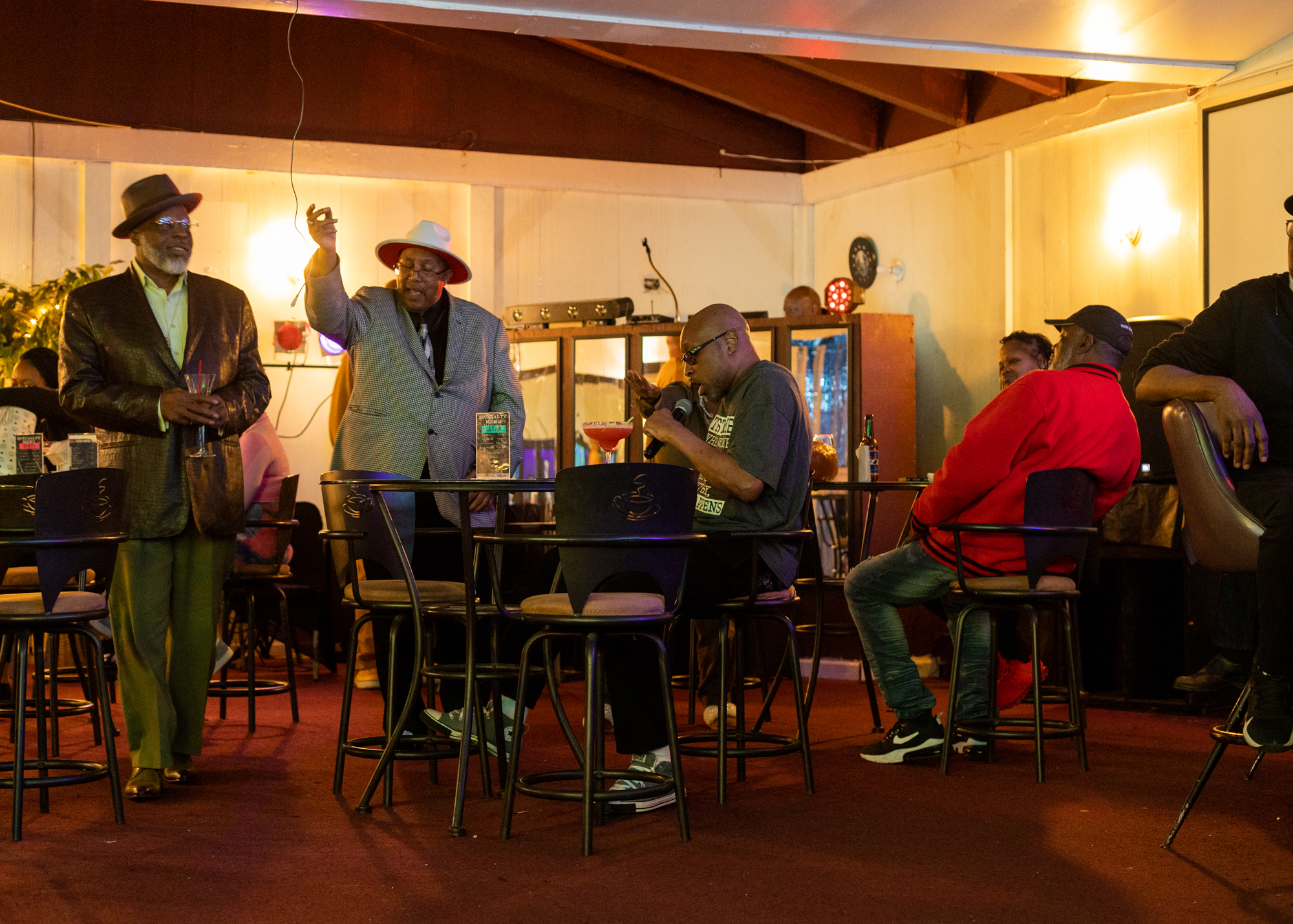 Lester Hambone Brown and Kill-Bill Sumler take the stage with the Eclipse Band during the Golden Leaf Club’s 100th Anniversary Celebration on Oct. 3, 2021. The pair of musicians have decades of memories at the club.. (KT Kanazawich | Flint Beat)