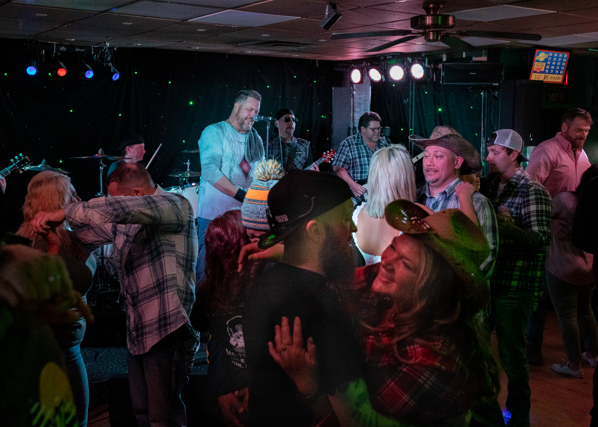Guests dance to the band Bullhonky Deluxe at Sherman’s Lounge on the south side of Flint, Mich. on April 9, 2022. (KT Kanazawich | Flint Beat)