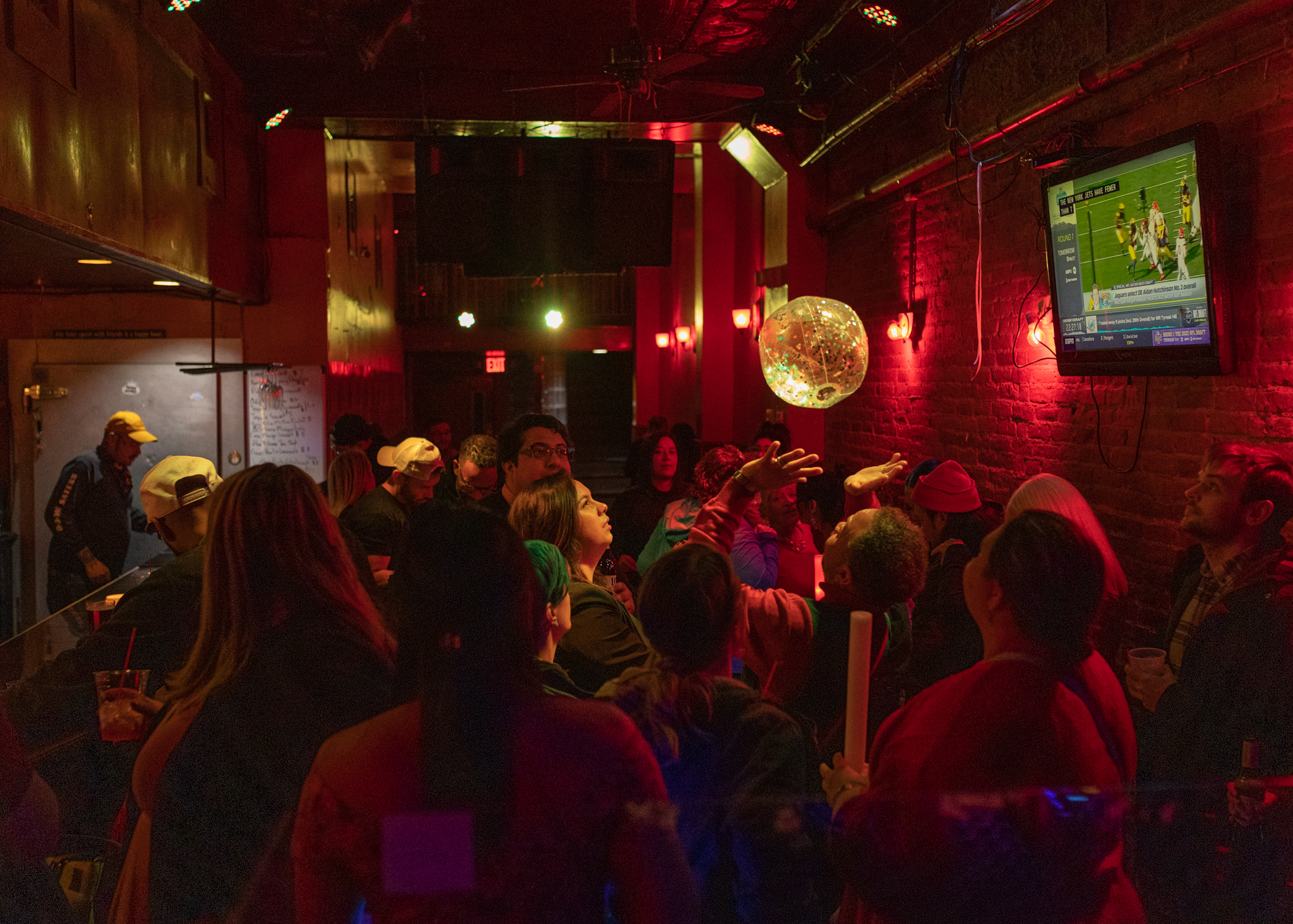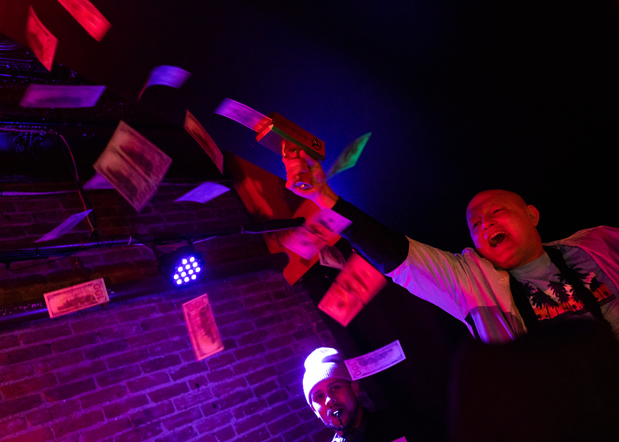 The Loft bar owner Rodney Ott releases fake $100 bills onto the dance floor during Latin Night on April 27, 2022. (KT Kanazawich | Flint Beat)
