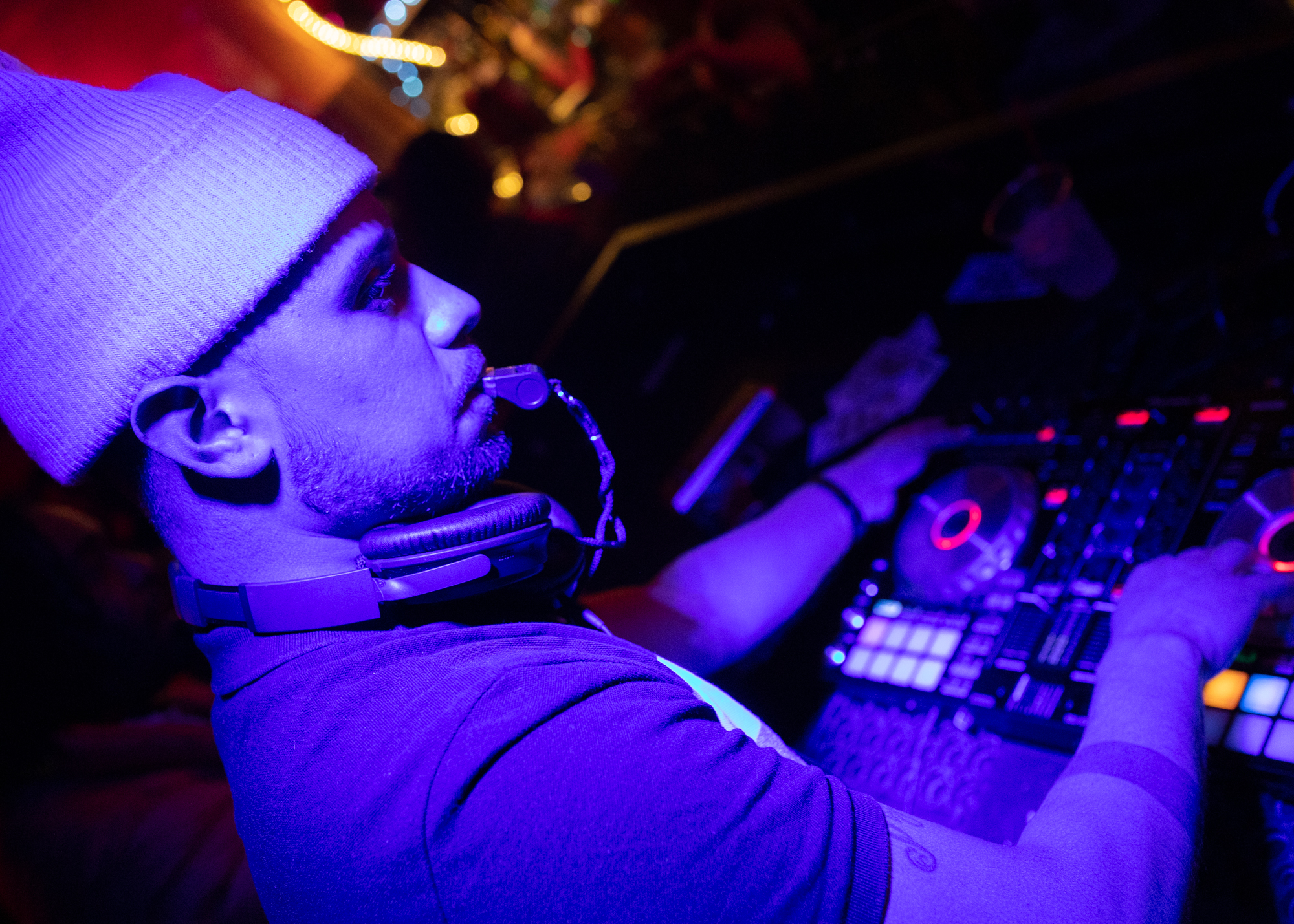 Asa Zuccaro DJ’s a Latin Night party at The Loft in downtown Flint, Mich. on April 27, 2022. Zuccaro started doing regular Latin Nights at the Loft to provide a party space for the Latinx community with cultural music. (KT Kanazawich | Flint Beat)