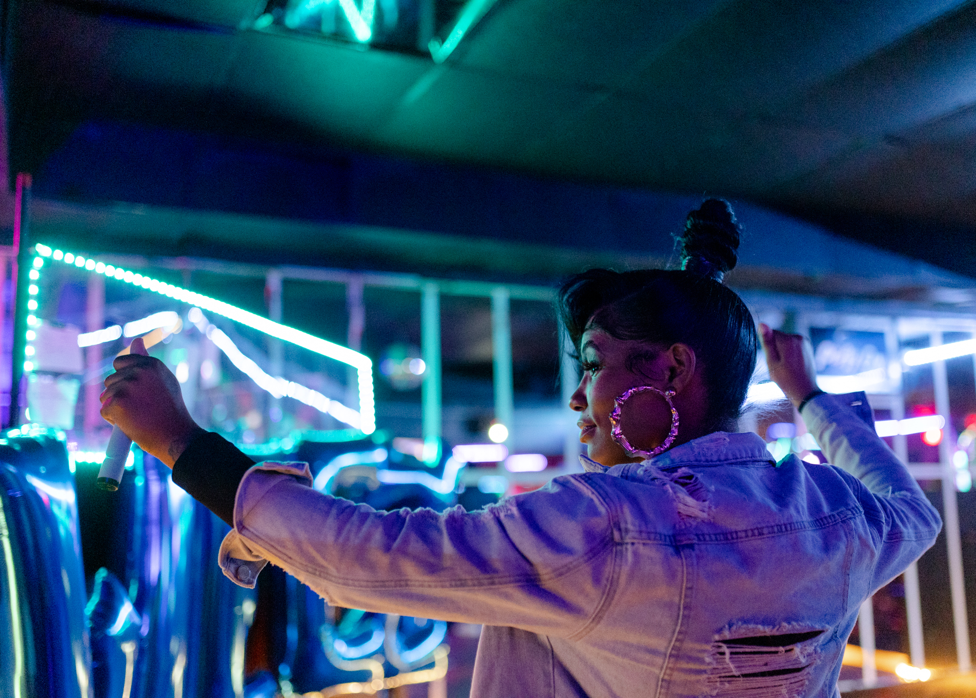 Bri Jones, of Nashville, TN, dances at Vibez nightclub on the north side of Flint, Mich. on April 10, 2022. (KT Kanazawich | Flint Beat)