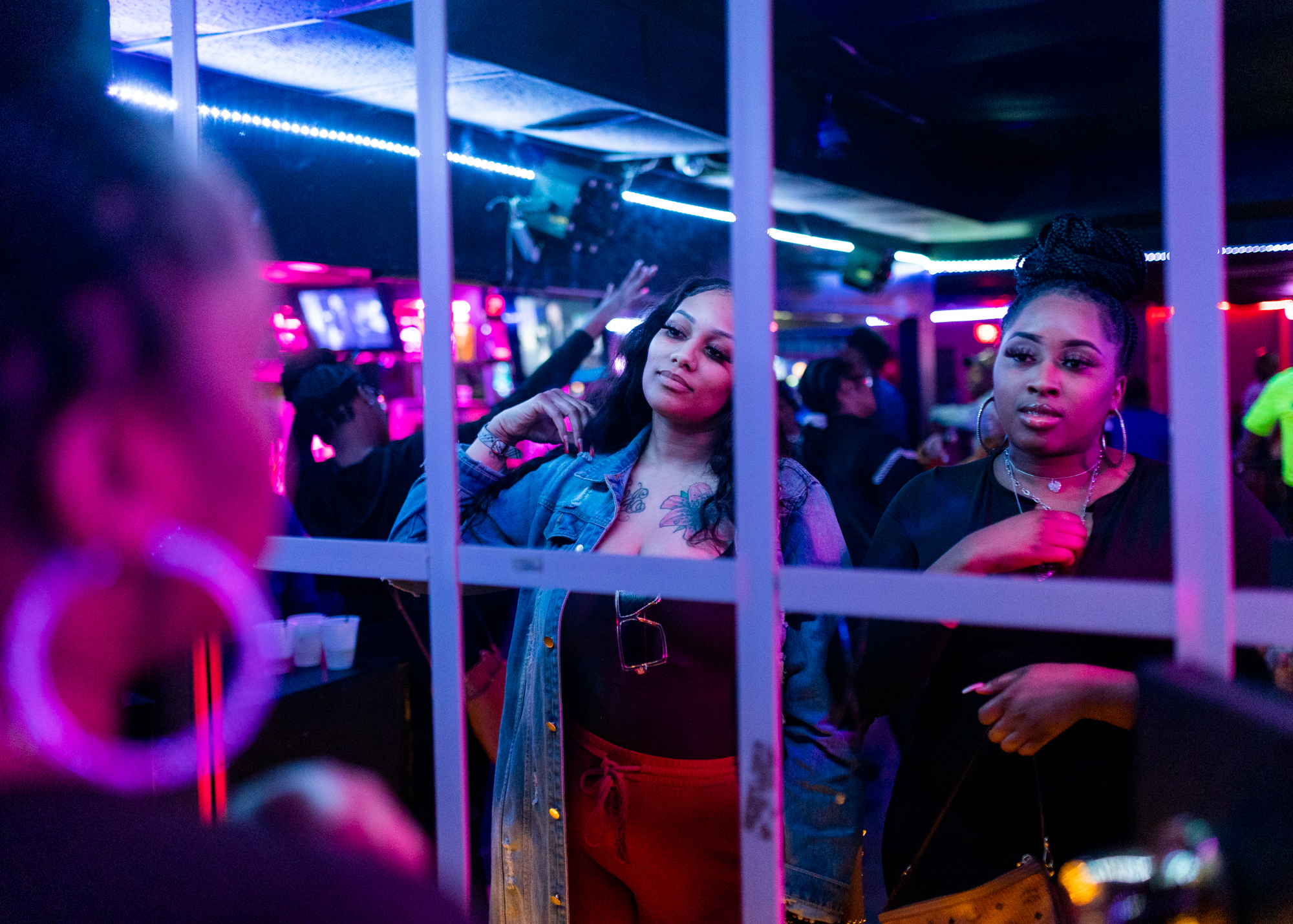 Artist Bella Sunshiine and Shawndriekia Cooper, of Flint, gaze in the mirror at Vibez nightclub during the Last Night Out (Sundays at Vibez) event on the north side of Flint, Mich. on April 10, 2022.