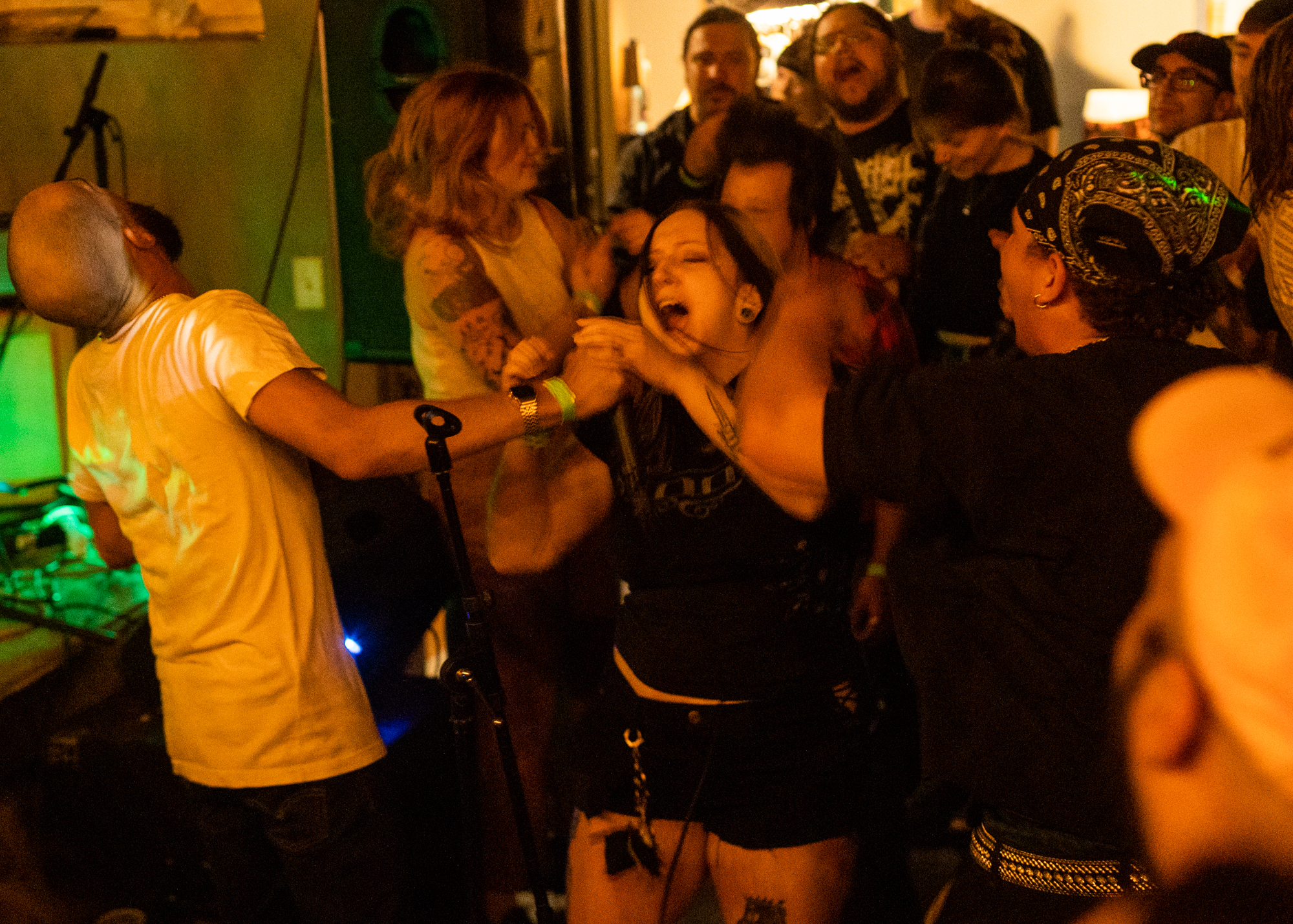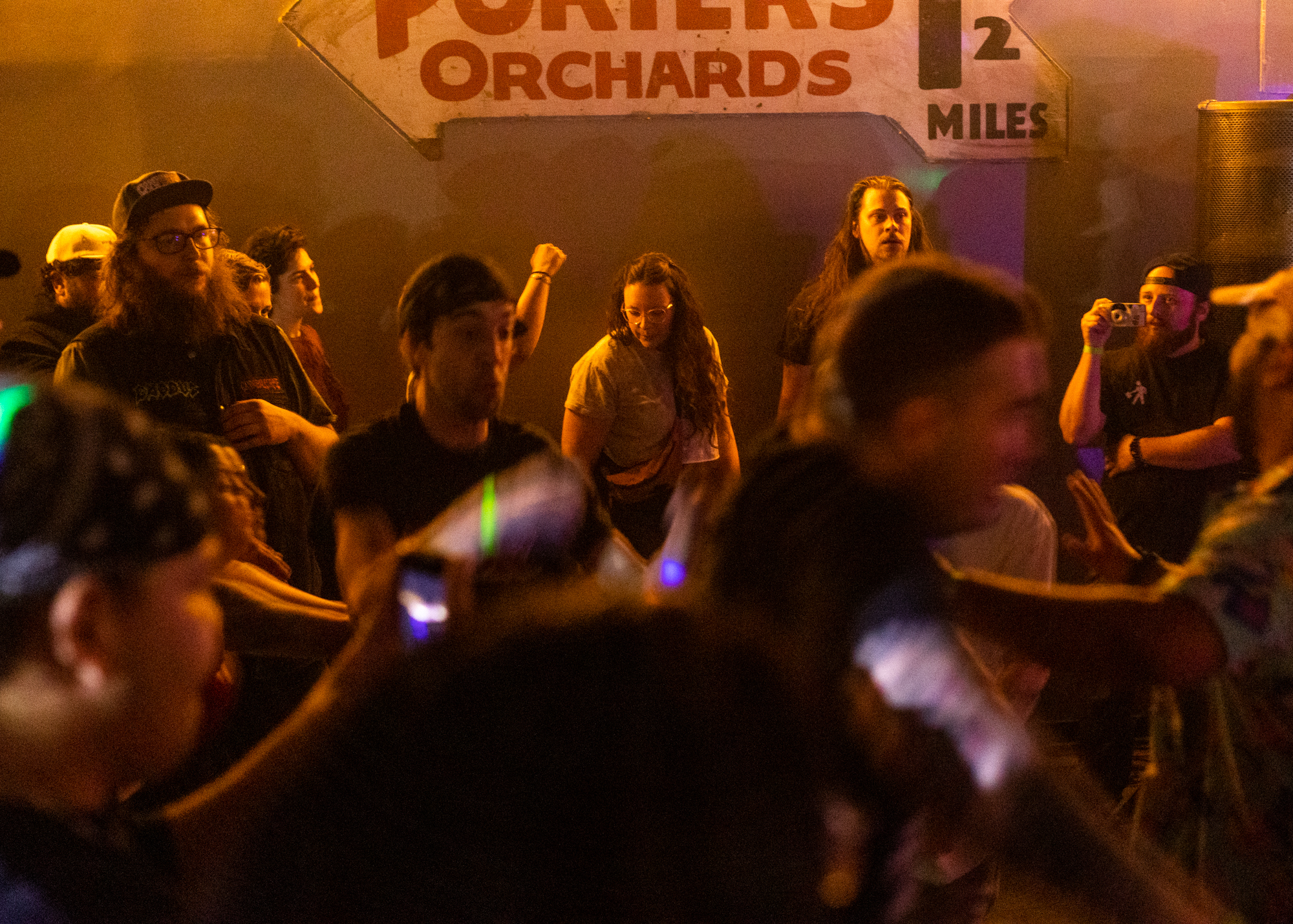 The crowd moshes, a dance where people collide into each other typically done to rock music, during a show at Flint City Hard Cider Co. in downtown Flint, Mich. on June 3, 2022. (KT Kanazawich | Flint Beat)Fans sing during Steam Roller’s performance at Flint City Hard Cider Co. in downtown Flint, Mich. on June 3, 2022. (KT Kanazawich | Flint Beat)