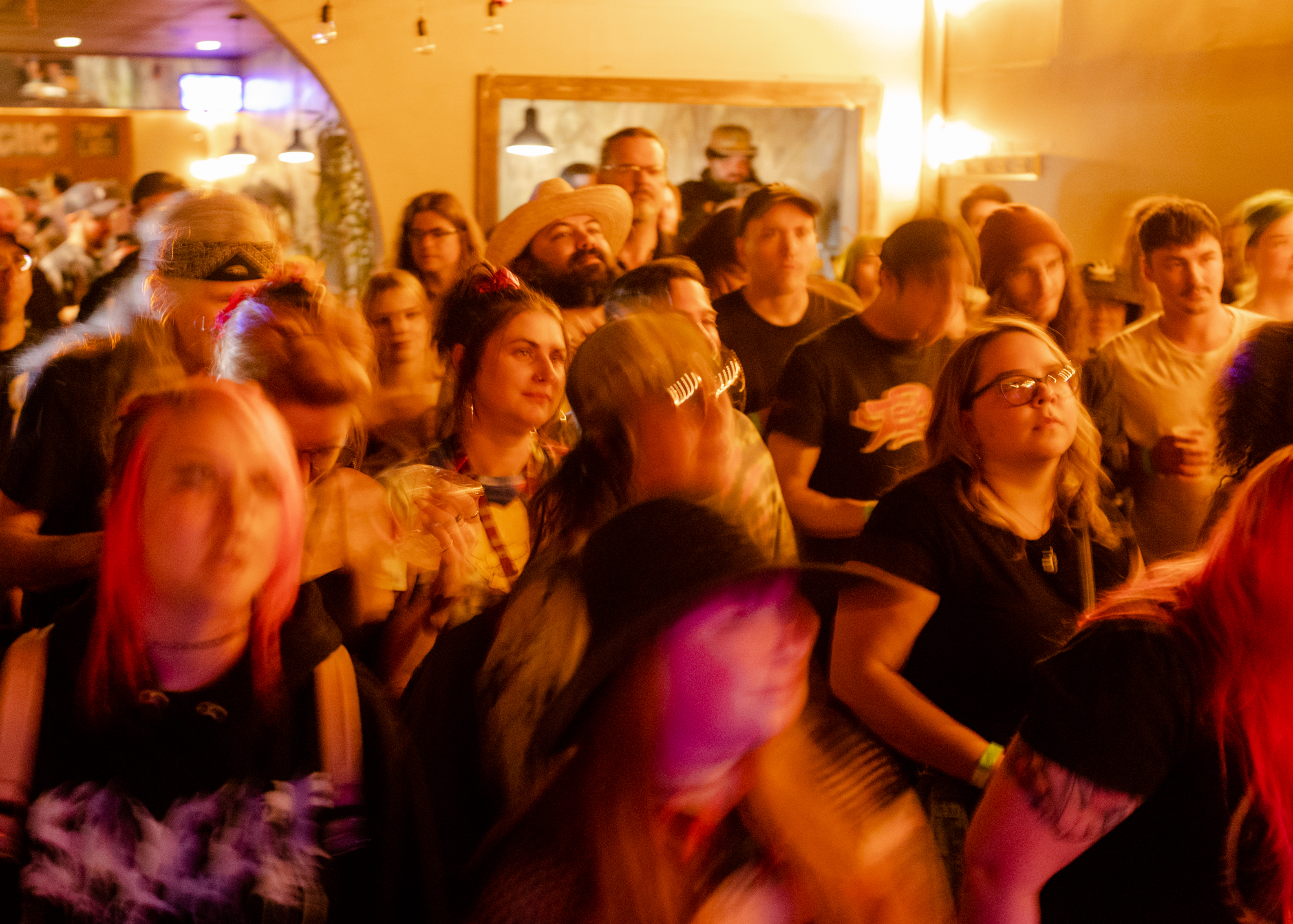 The crowd at Flint City Hard Cider Co. in downtown Flint, Mich. dances to the band Butchcraft on June 3, 2022. (KT Kanazawich | Flint Beat)