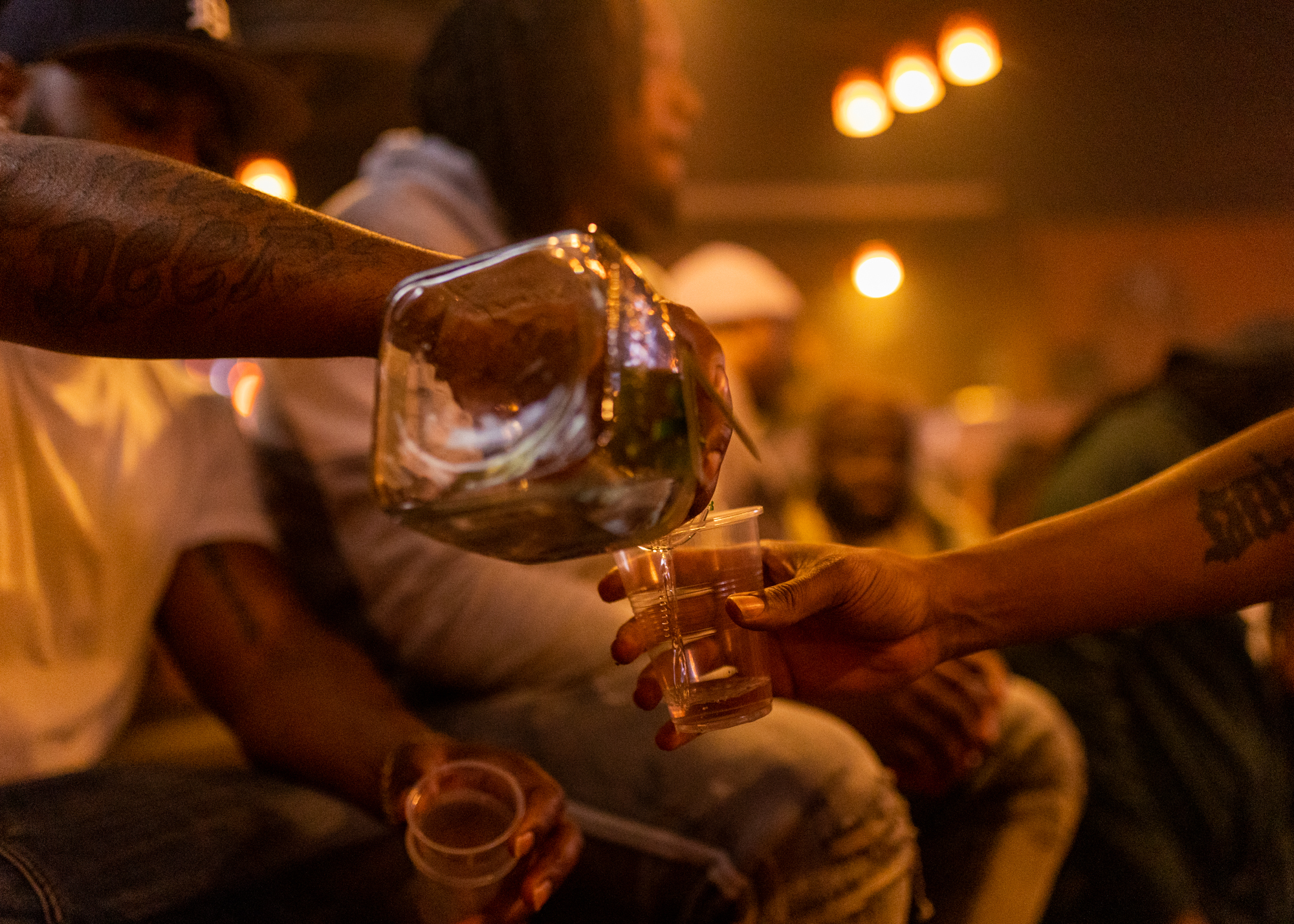 Club goers pour a shot of Patron at the Vets Club on the south side of Flint, Mich. on April 29, 2022. (KT Kanazawich | Flint Beat)