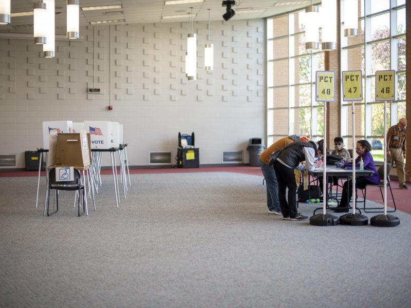 Flint southsiders vote at Freeman Elementary on Election Day 2020. For 2 hours in the afternoon, the neighborhood including the school lost power. There was no disturbance in the voting process, but voters had to use the flashlights on their smart phones for illumination at the booths. (KT Kanazawich