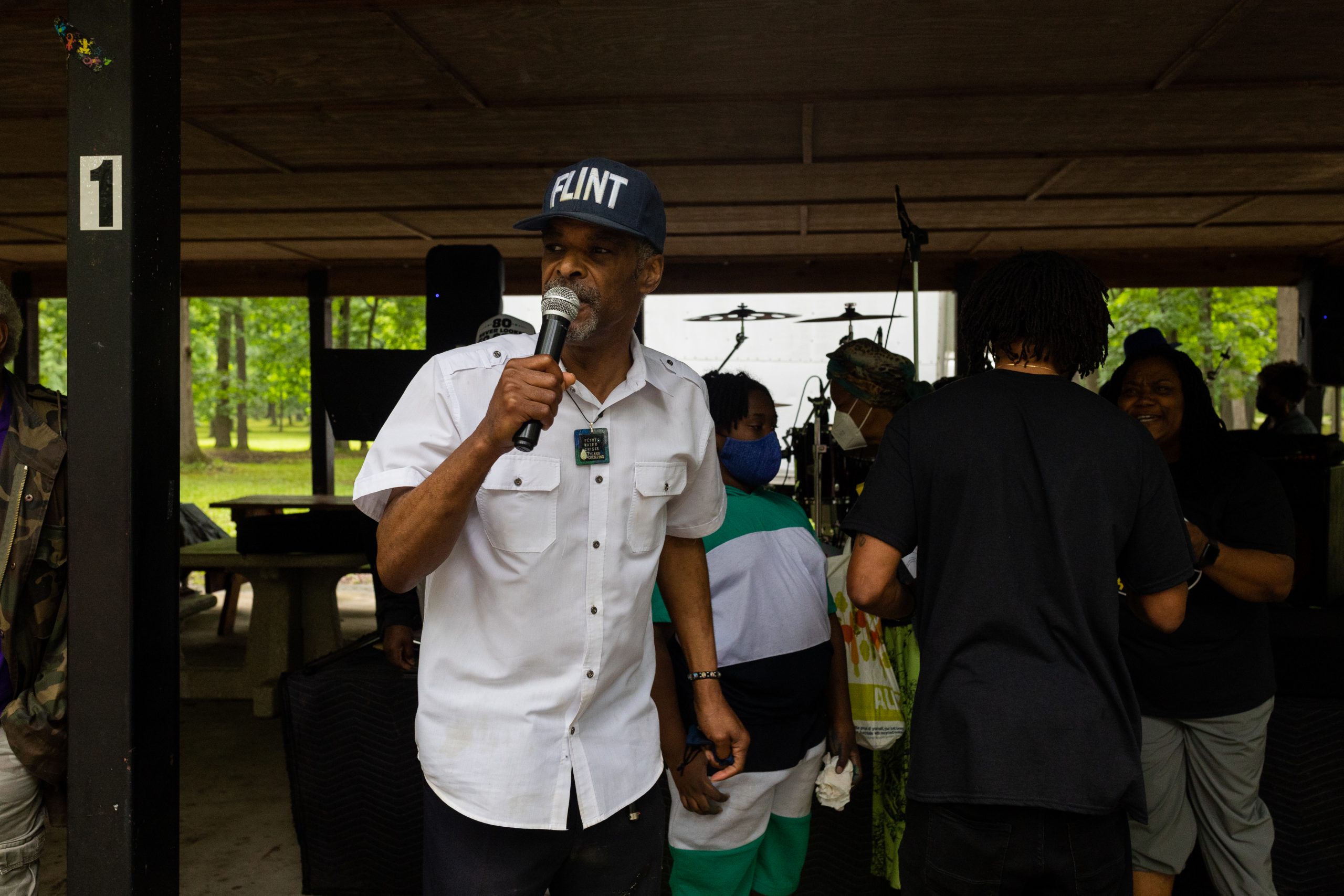 First Ward City Councilman Eric Mays speaks at the Traditional Juneteenth Celebration at Max Brandon Park in Flint, Mich. on June 19, 2021. (KT Kanazawich | Flint Beat)