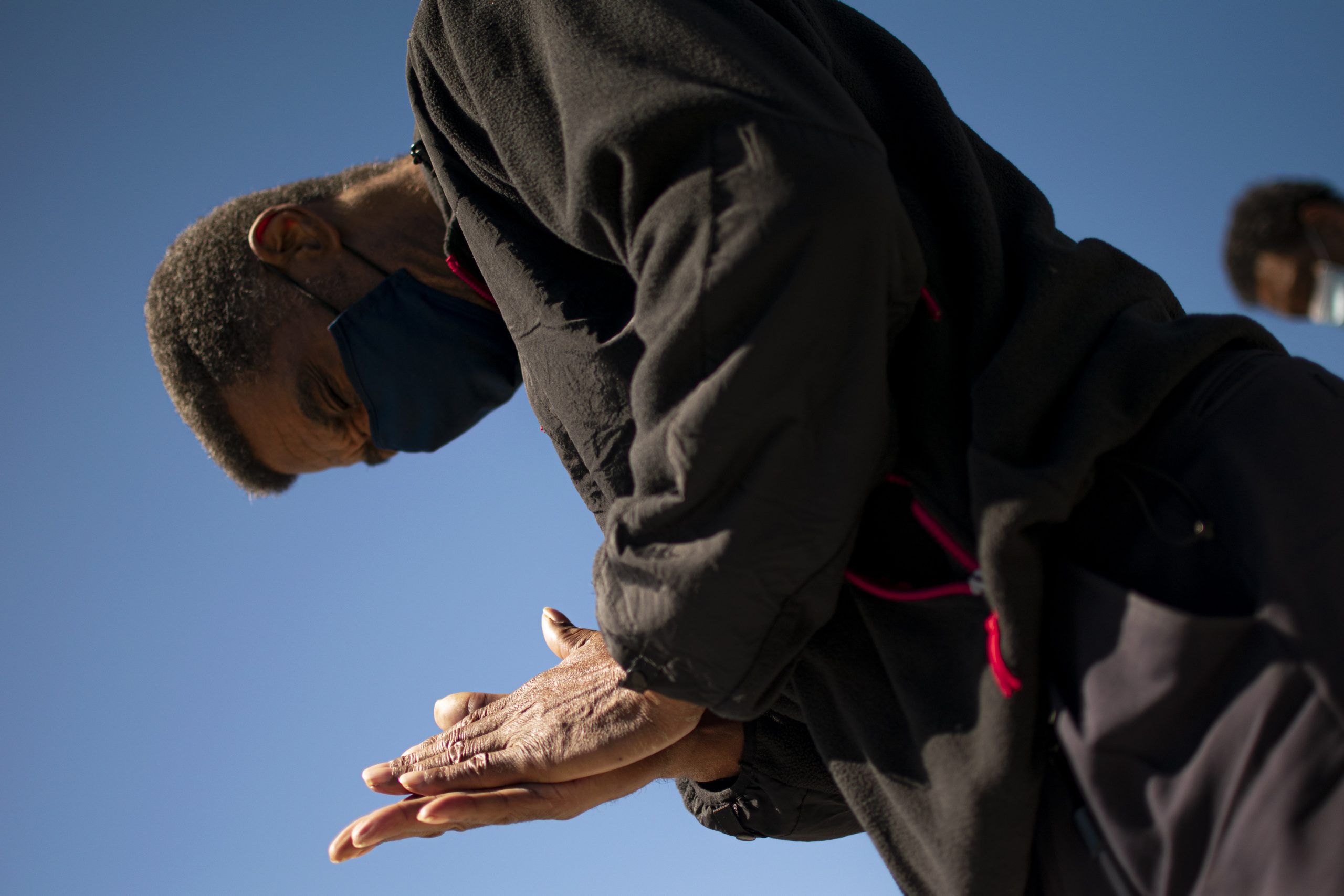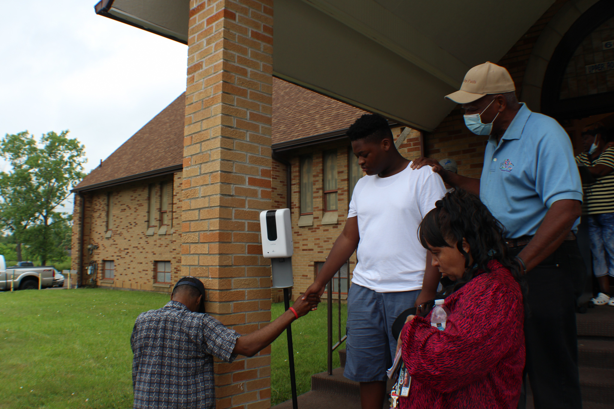 Eric Mays, Councilman of Flint’s Ward 1, kneels and bows his head in prayer as he holds the hand of another attendee praying at the 20th Annual Unity March on June 26, 2021. (Khue Tran | Flint Beat)