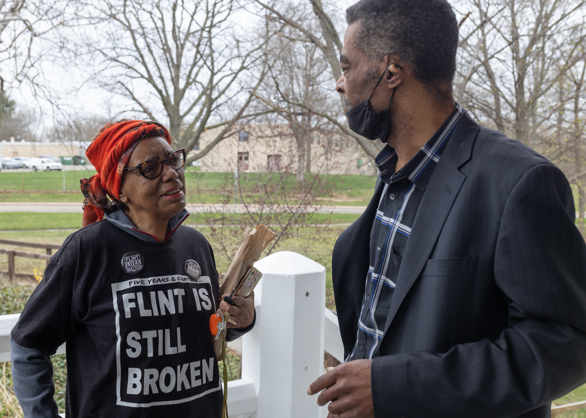 Water Warrior Clara McClinton and First Ward City Councilman Eric Mays chat during the 8th anniversary of the Flint Water Crisis event on April 25, 2022, at Kearsley Park. The event was held to raise awareness that the water crisis continues. (KT Kanazawich | Flint Beat)