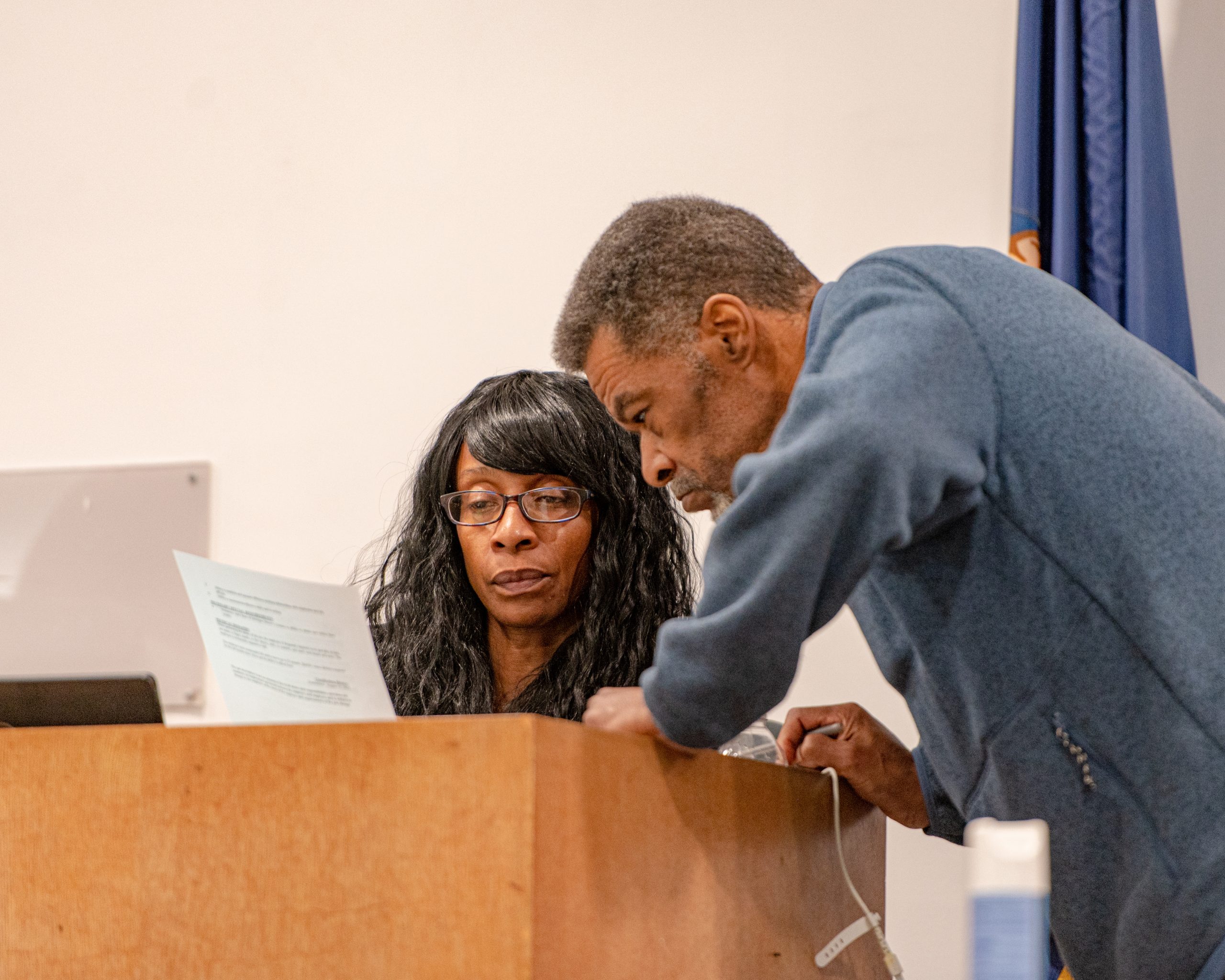 Flint City Councilman Eric Mays speaks with Davina Donahue, the interim clerk for the City of Flint, Mich., during Flint City Council’s Special Affairs Committee meeting at Flint City Hall on Monday, Nov. 14, 2022. (Michael Indriolo | Flint Beat)