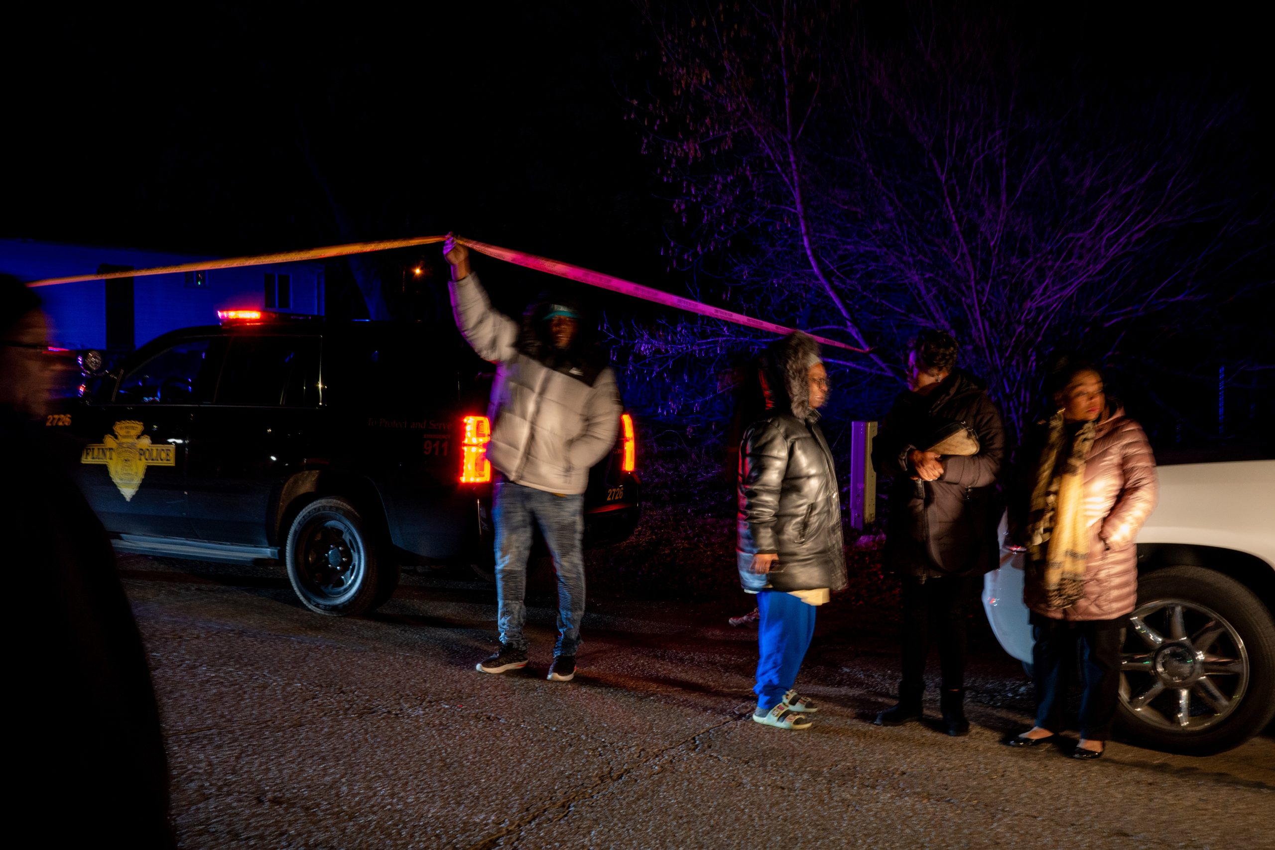 Flint City Council members Tonya Burns and Jerri Winfrey-Carter gather with residents mourning the death of Flint City Councilman Eric Mays on East Russell Avenue, the street he lived on, on Saturday, Feb. 24, 2024. (Michael Indriolo | Flint Beat)