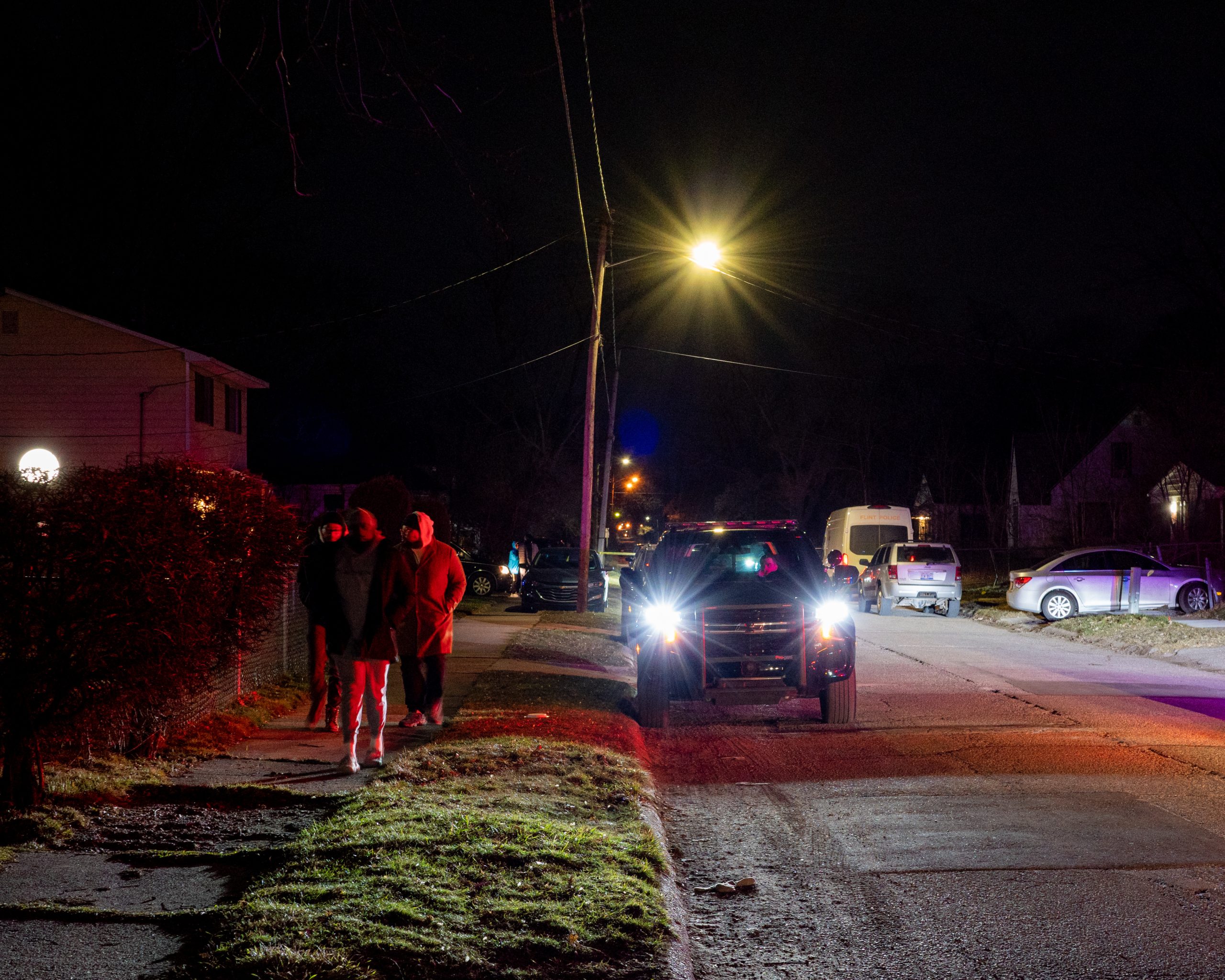 Kevin Mays and other family members walk down the sidewalk after talking with police about the death of Eric Mays, Kevin Mays’ uncle, on East Russell Avenue on Saturday, Feb. 24, 2024. (Michael Indriolo | Flint Beat)