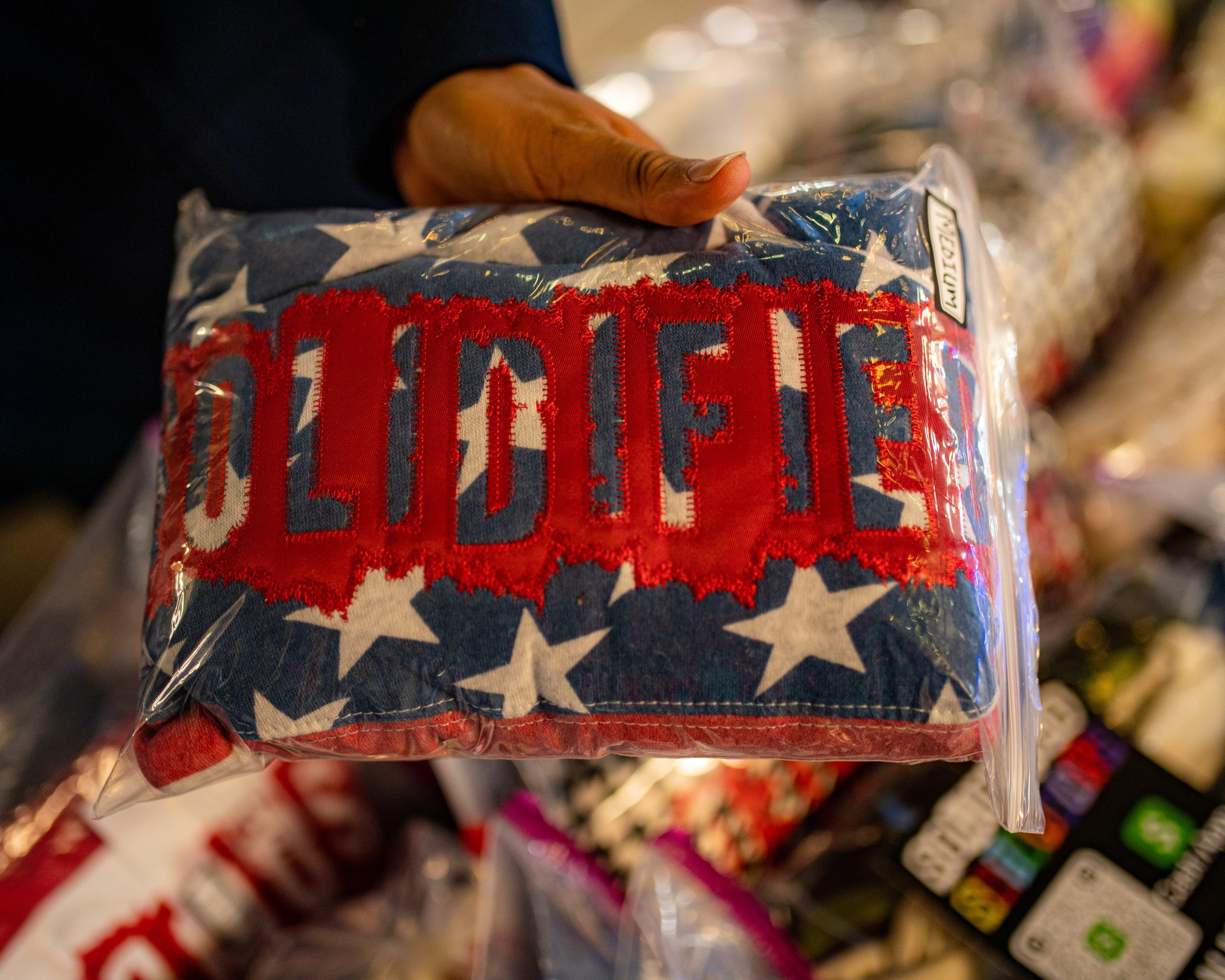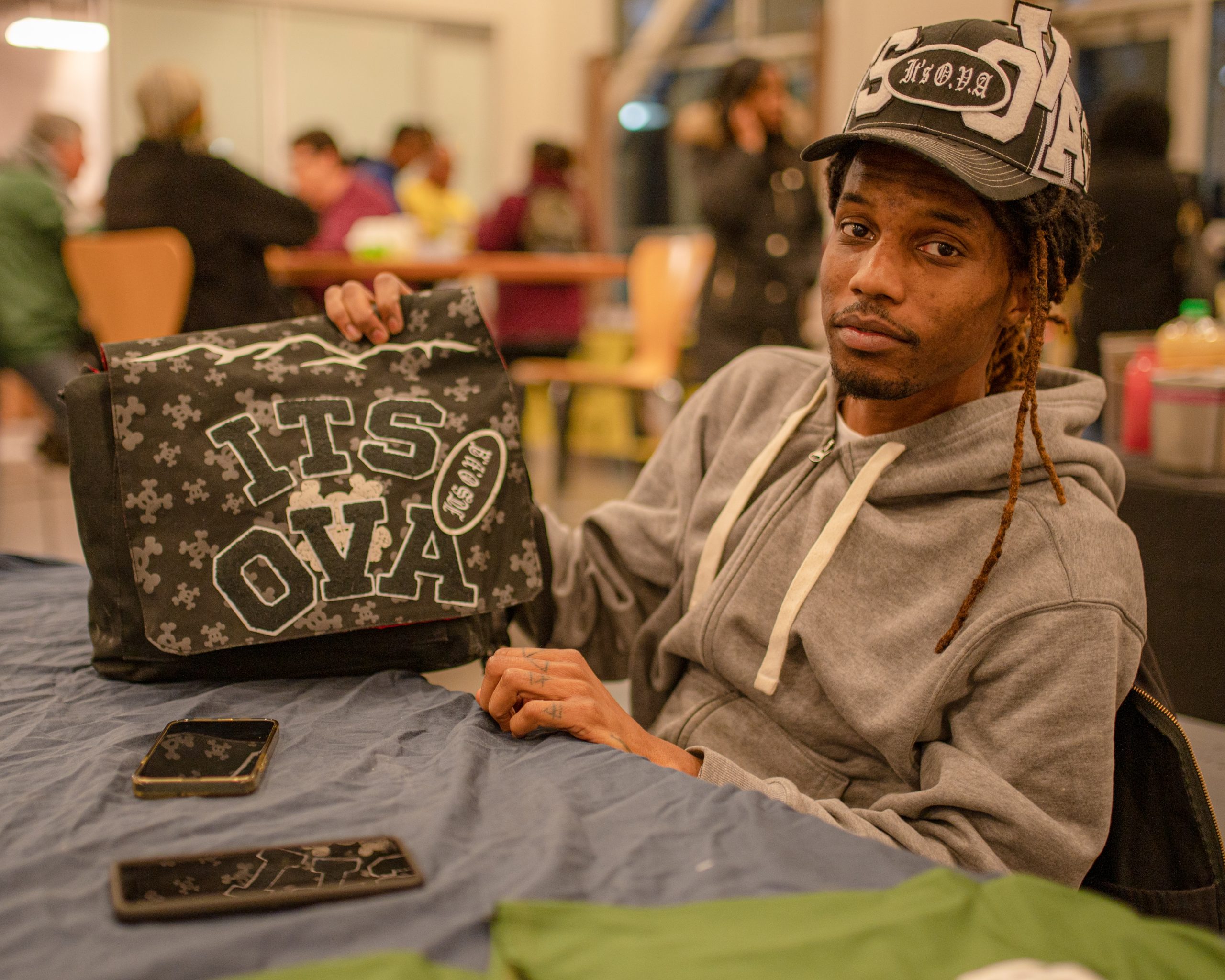 Kendrick Hood holds up a bag he designed for the first line of his clothing brand It’s O.V.A. during the Black Dollar Black History Month Social at the Flint Farmers’ Market on Friday, Feb. 24, 2023. (Michael Indriolo | Flint Beat)