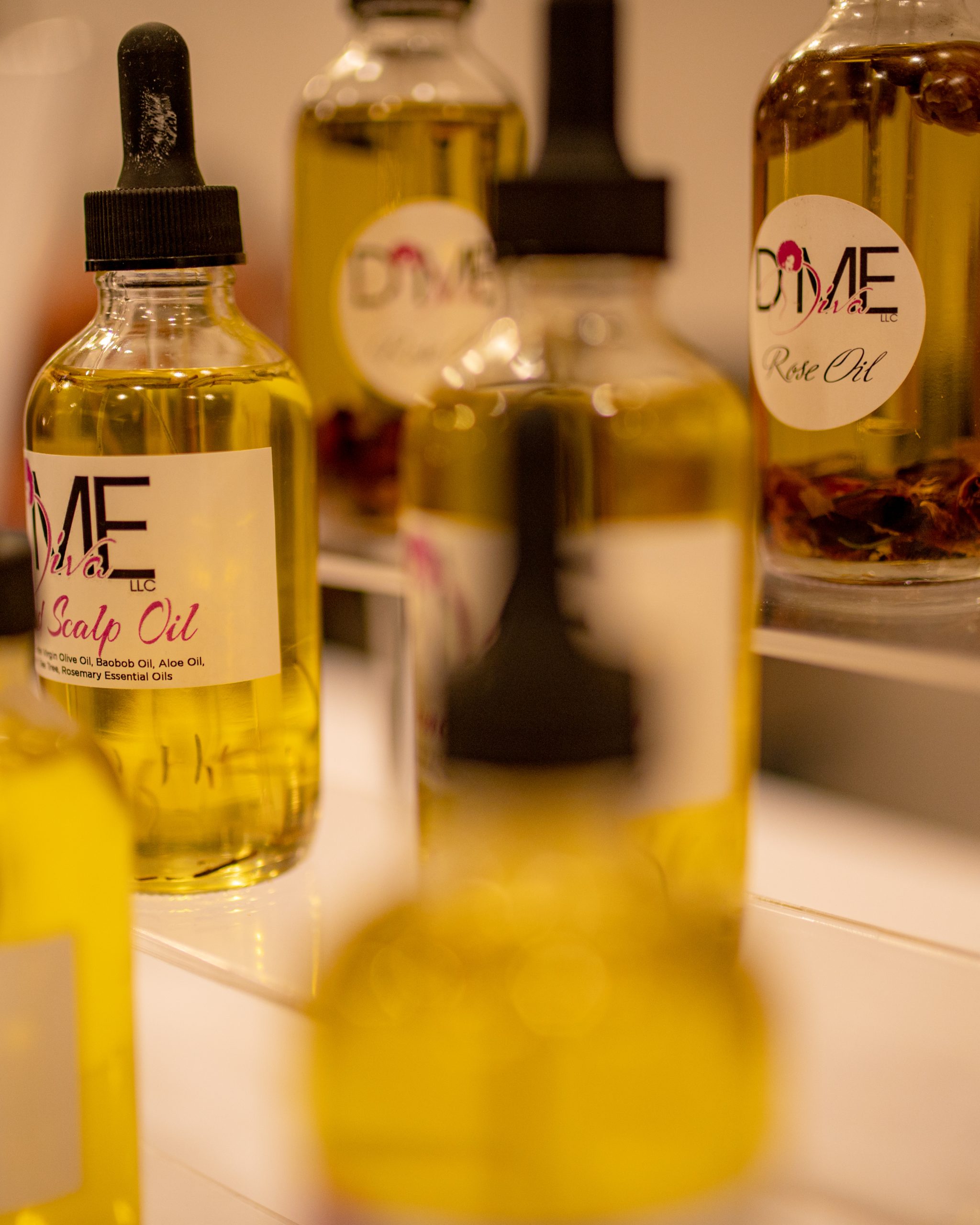 Karima Majied displays handmade hair oils on the table for her business, Dime Diva LLC, during the Black Dollar Black History Month Social at the Flint Farmers’ Market on Friday, Feb. 24, 2023. (Michael Indriolo | Flint Beat)