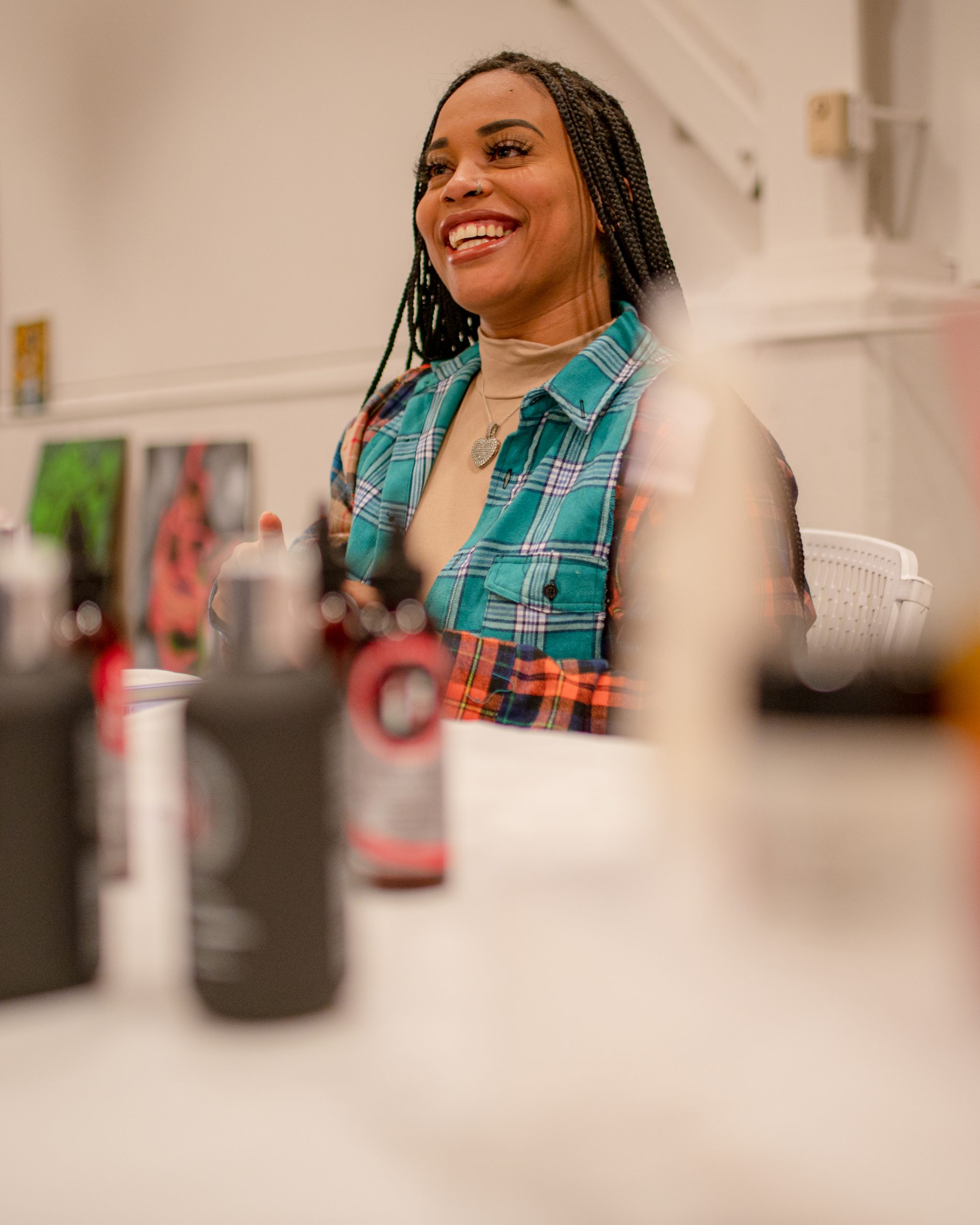 Shunta Love, a dental hygienist and an entrepreneur who owns A & V Accessories and Boutique, speaks during the panel discussion at the Black Dollar Black History Month Social at the Flint Farmers’ Market on Friday, Feb. 24, 2023. (Michael Indriolo | Flint Beat)