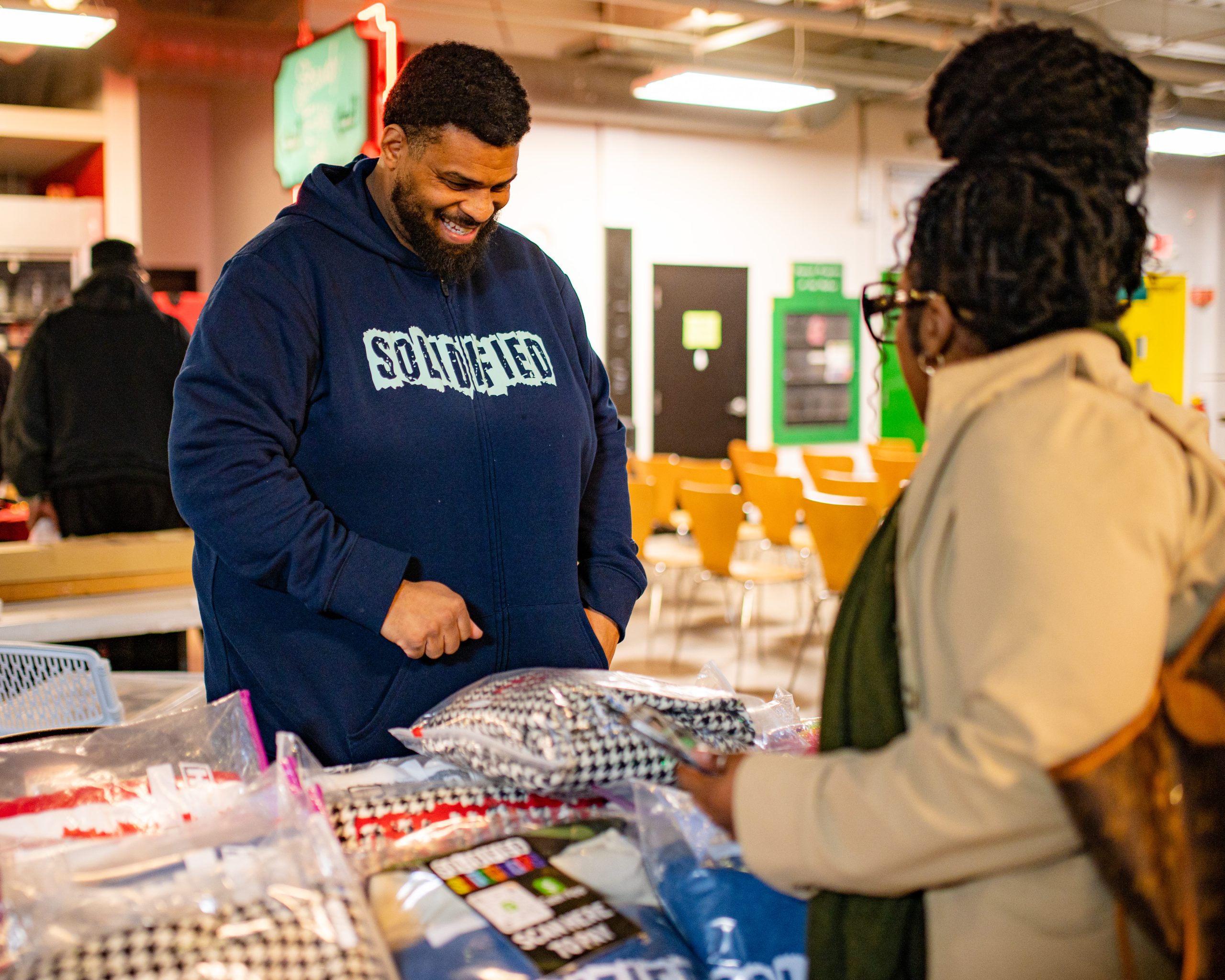 Ondante Lott, founder of Solidified Clothing, smiles as he talks with a customer during the Black Dollar Black History Month Social at the Flint Farmers’ Market on Friday, Feb. 24, 2023. (Michael Indriolo | Flint Beat)
