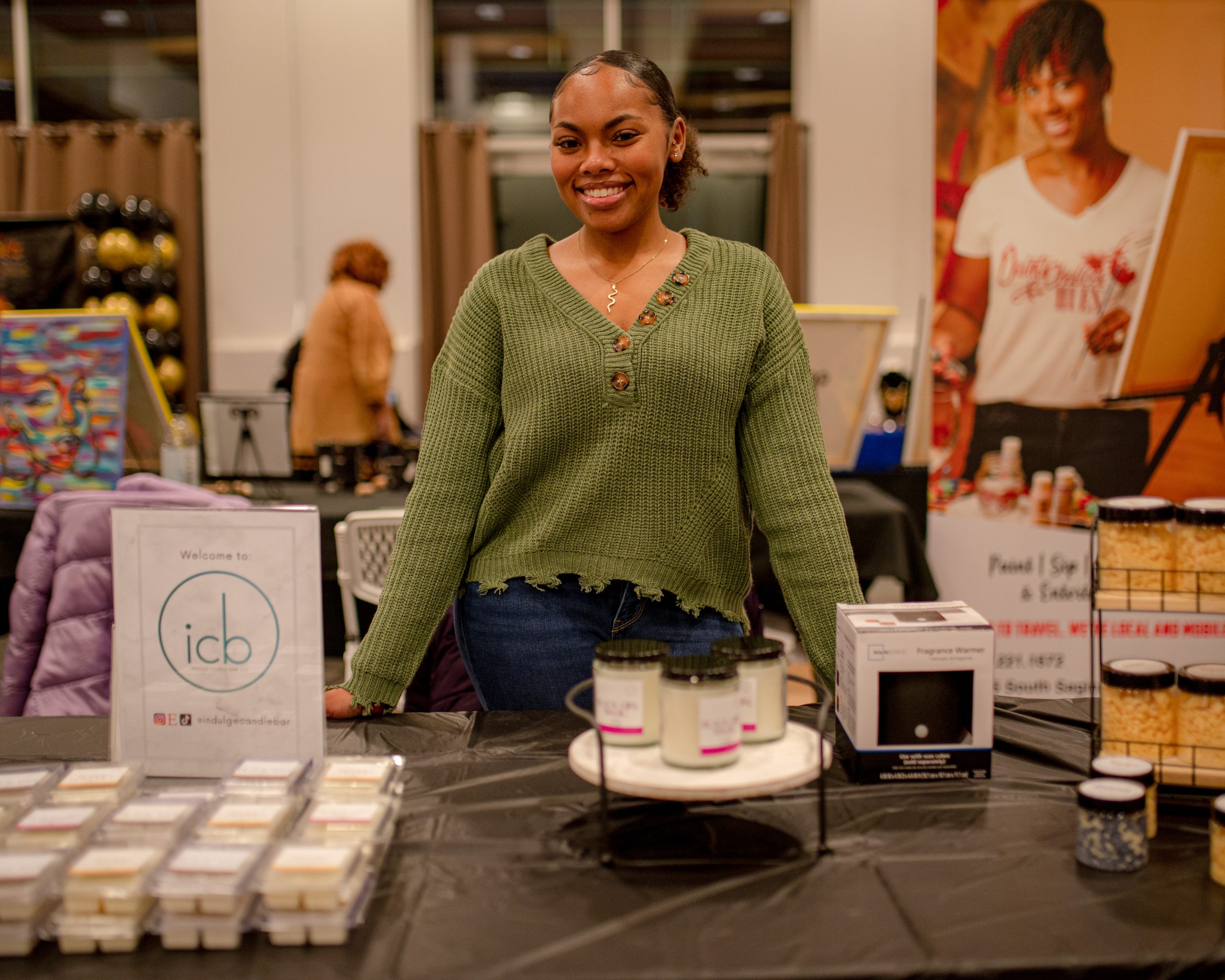 Brekell Bee poses behind the table for her handmade candle business, Indulge Candle Bar, during the Black Dollar Black History Month Social at the Flint Farmers’ Market on Friday, Feb. 24, 2023. (Michael Indriolo | Flint Beat)