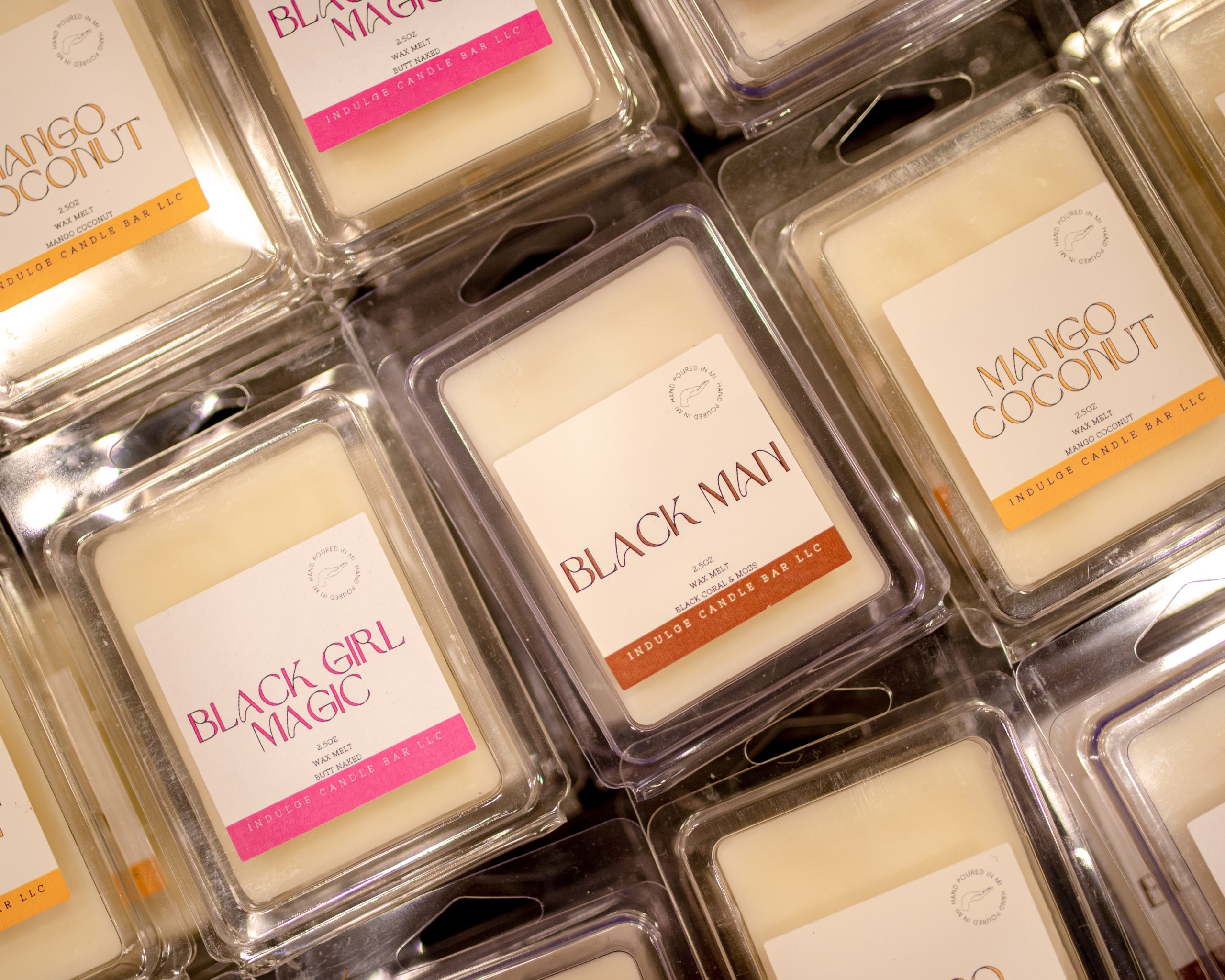 Brekell Bell displays handmade wax melts on the table for her business, Indulge Candle Bar, during the Black Dollar Black History Month Social at the Flint Farmers’ Market on Friday, Feb. 24, 2023. (Michael Indriolo | Flint Beat)