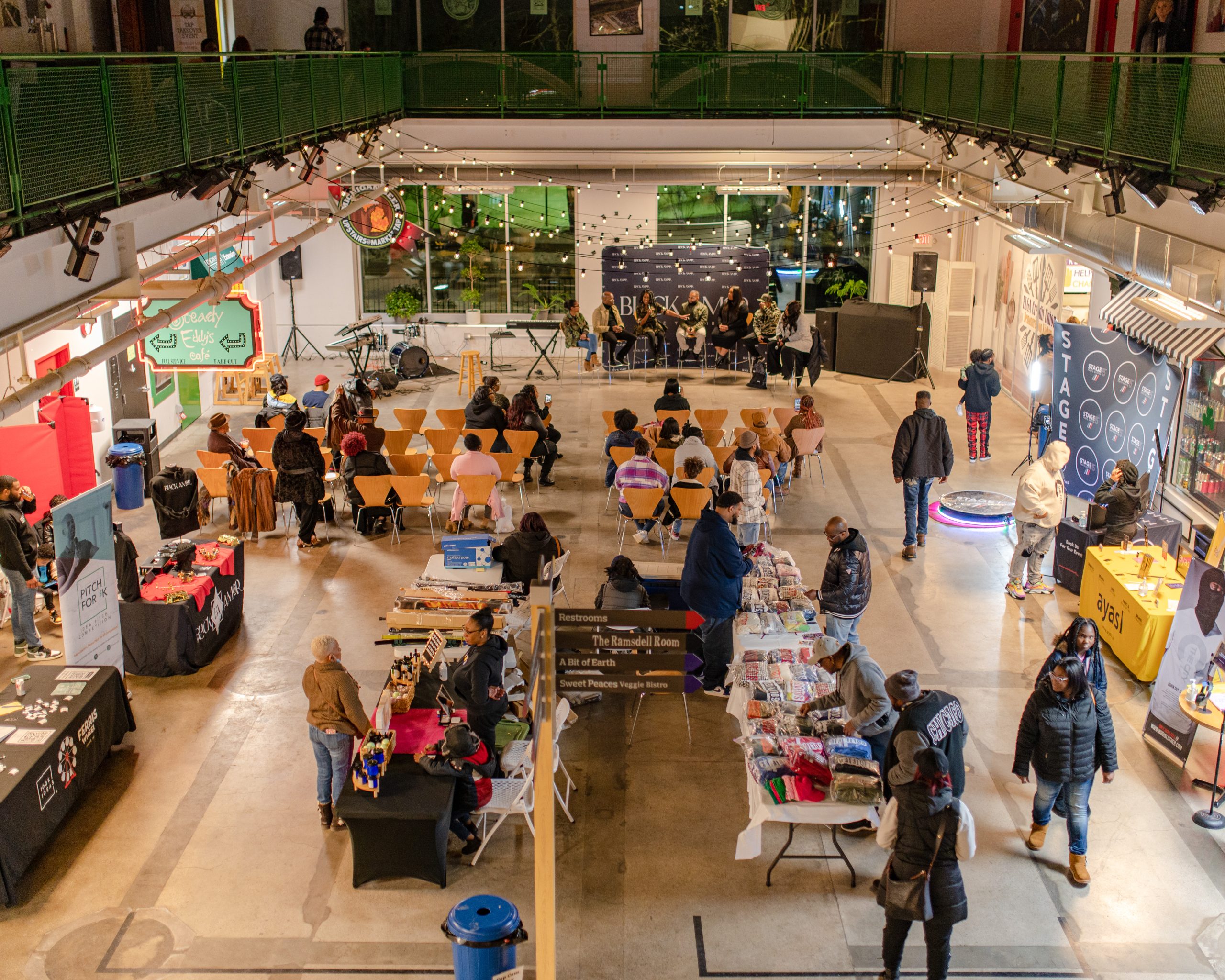 Panelists discuss lessons they’ve learned as entrepreneurs during the Black Dollar Black History Month Social at the Flint Farmers’ Market on Friday, Feb. 24, 2023. (Michael Indriolo | Flint Beat)