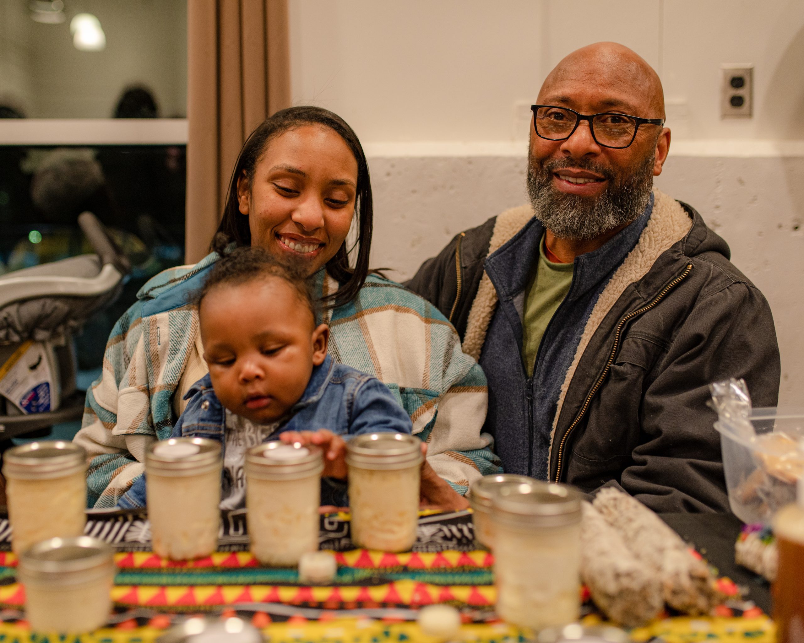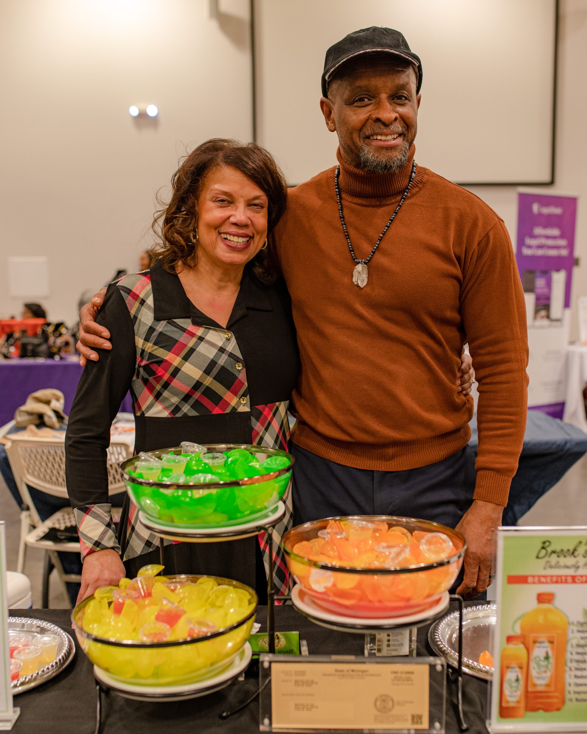 Ladonna Wyatt and Ples Wyatt, owners of Brook’s Tea, smile for a portrait during the Black Dollar Black History Month Social at the Flint Farmers’ Market on Friday, Feb. 24, 2023. (Michael Indriolo | Flint Beat)