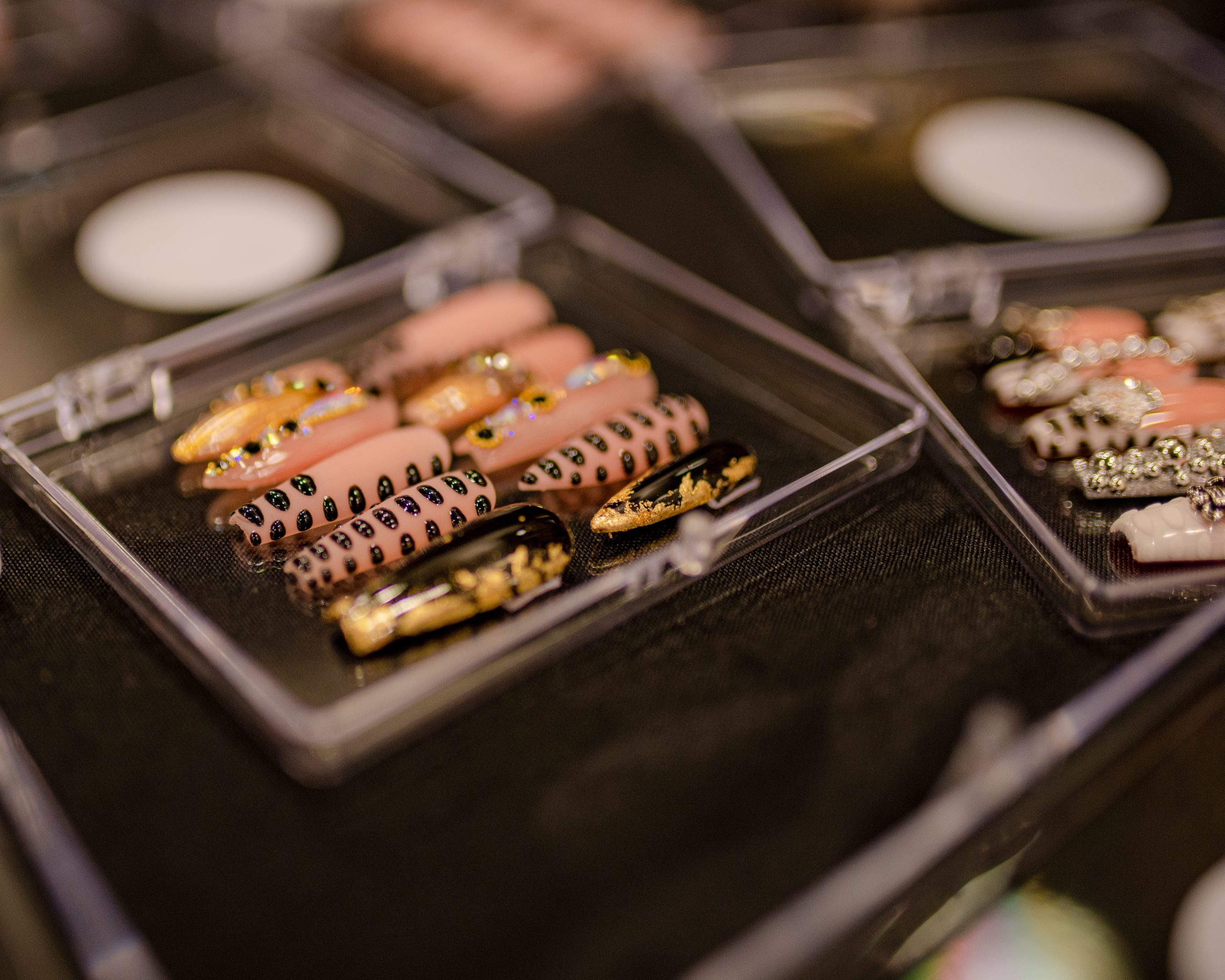 Niy Hall displays nails she hand-decorated at the table for her business, Fresh Sets, during the Black Dollar Black History Month Social at the Flint Farmers’ Market on Friday, Feb. 24, 2023. (Michael Indriolo | Flint Beat)