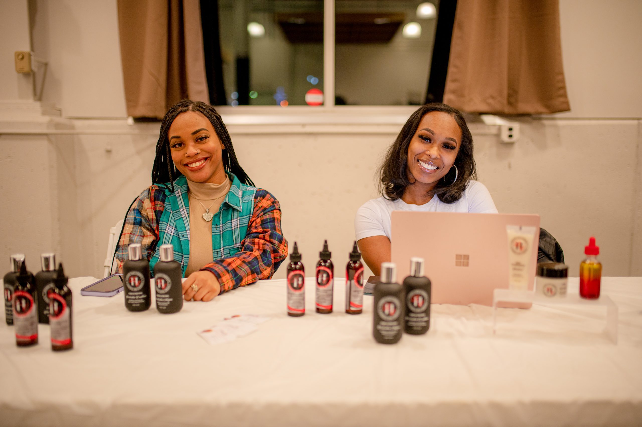Desi Boyce (right), the founder of Desired Hair Company, smiles with her best friend Sydney White (left) during the Black Dollar Black History Month Social at the Flint Farmers’ Market on Friday, Feb. 24, 2023. (Michael Indriolo | Flint Beat)