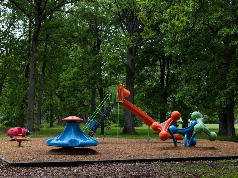 The playgrounds have everything a kid needs to safely slide, swing, climb, and spin to their heart’s content.