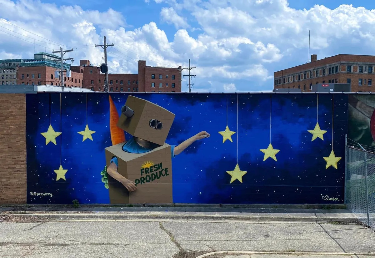 Since then, Fletcher has produced 16 murals around Flint, including the cardboard box robot reaching for the stars at the back of Flint City Hard Cider, his hummingbird on South Dort Hwy, and the Jaguars mural for the Flint Southwestern Jaguars in their stadium.