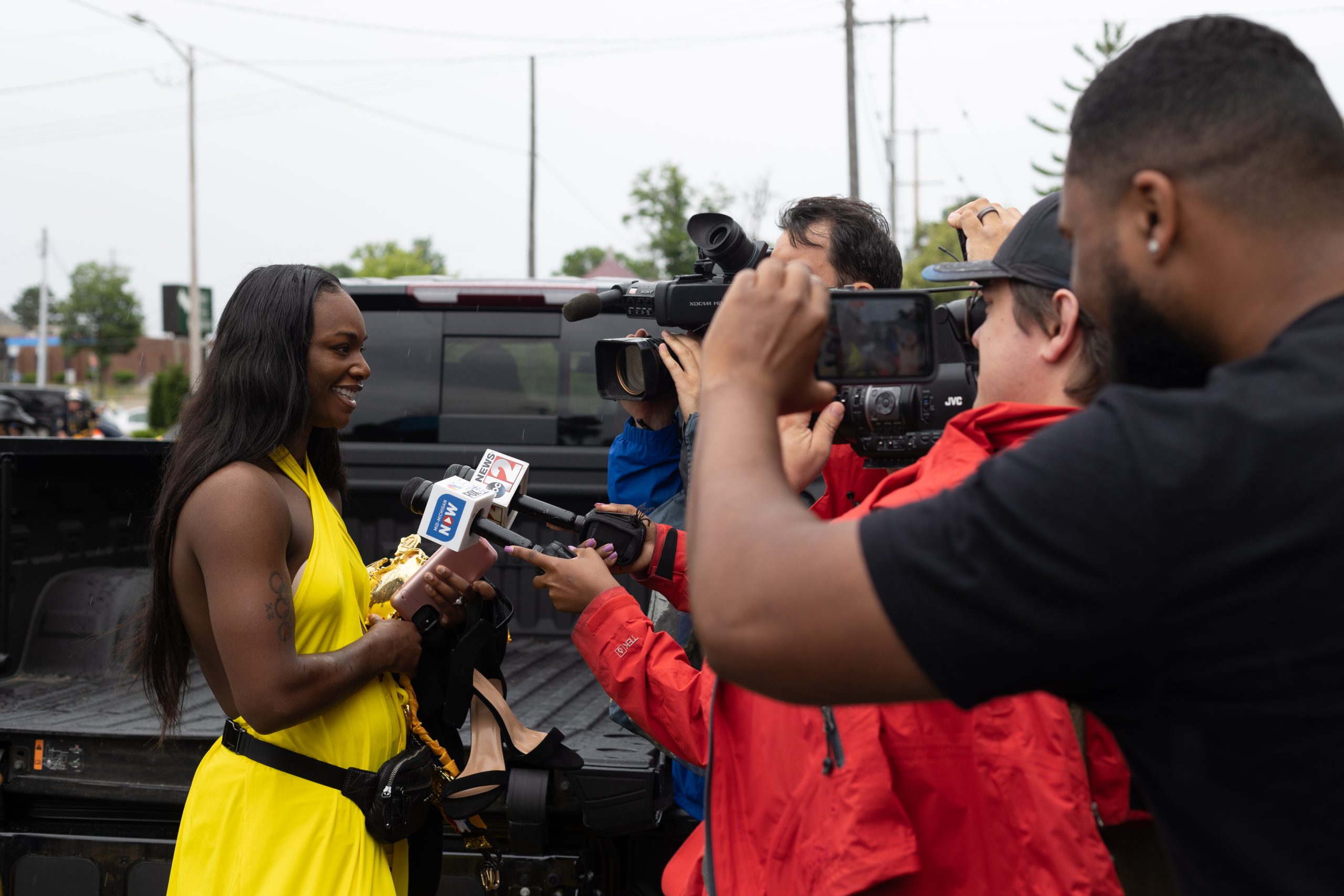 Flint’s Champ Claressa Shields leads the Juneteenth Champions Parade in Flint, Mich. (Santiago Ochoa | Flint Beat) .Claressa Shields is interviewed by media during the Champions Parade celebrating Juneteenth in Flint, Mich. On June 19, 2021. Shields was an honoree at the parade after becoming a record holder in the boxing ring and winning her first MMA fight the previous Thursday. (KT Kanazawich | Flint Beat)
