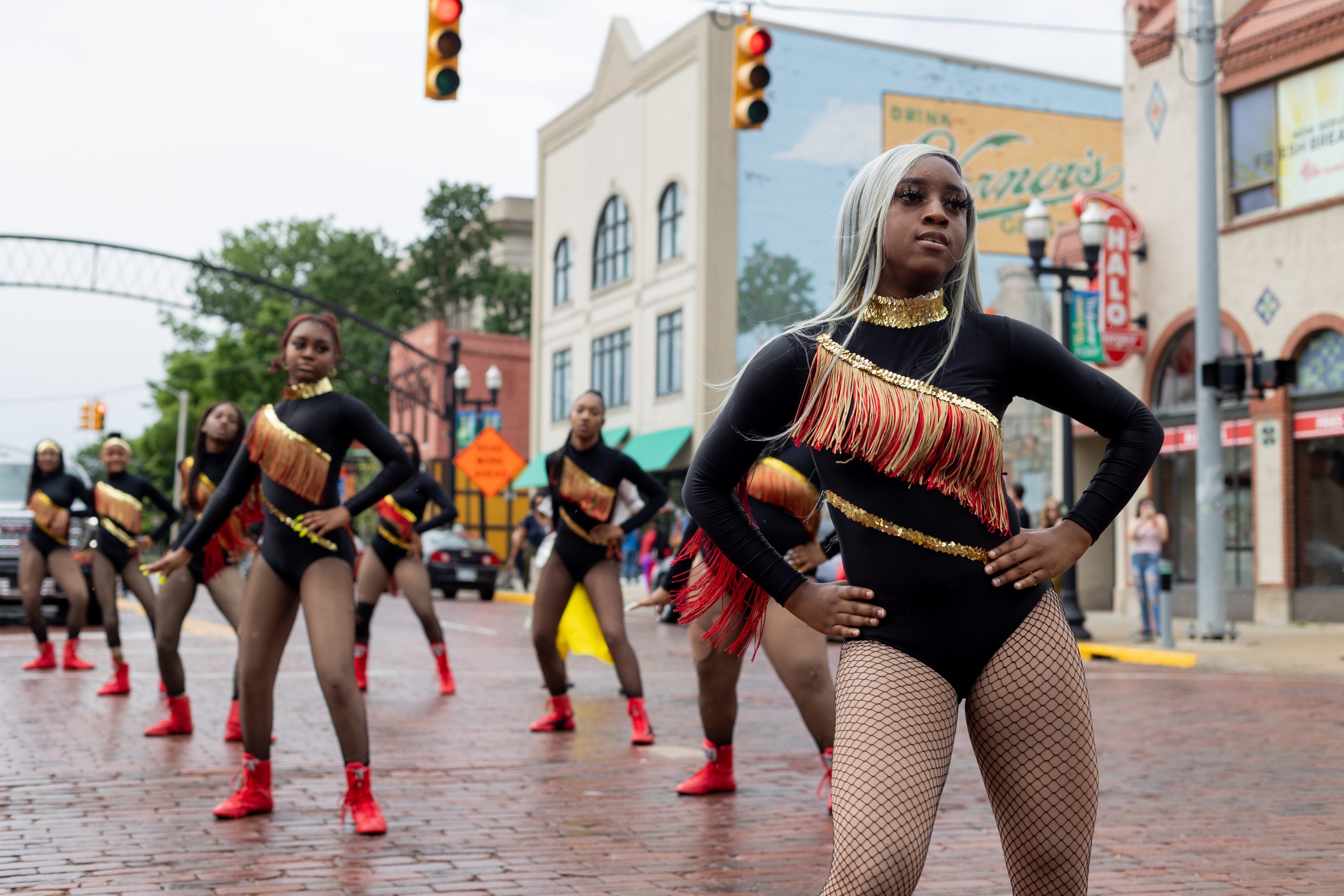 Shirmae Harris, 17, a Flint native, stops for a short solo performance as she leads the For The Love of Dance Studio down Saginaw Street on Saturday, June 19. (Santiago Ochoa | Flint Beat)