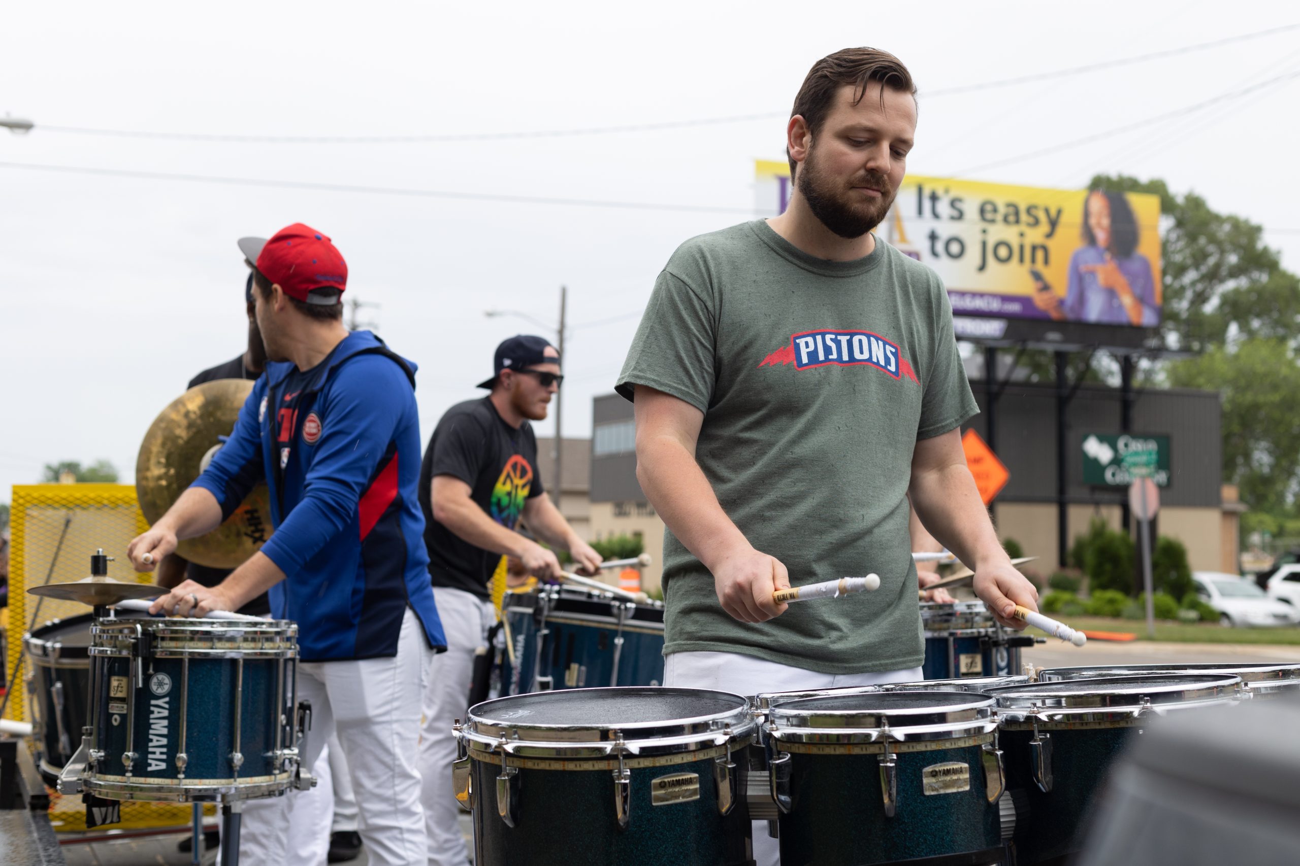 The Detroit Pistons Drumline leads the Chamions Parade celebrating Juneteenth on Saginaw Street in Flint, Mich. on June 19, 2021. (KT Kanazawich | Flint Beat)