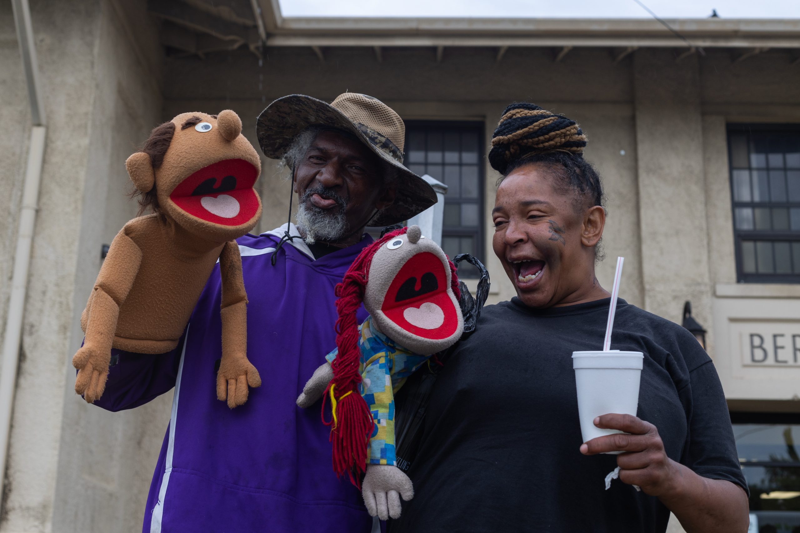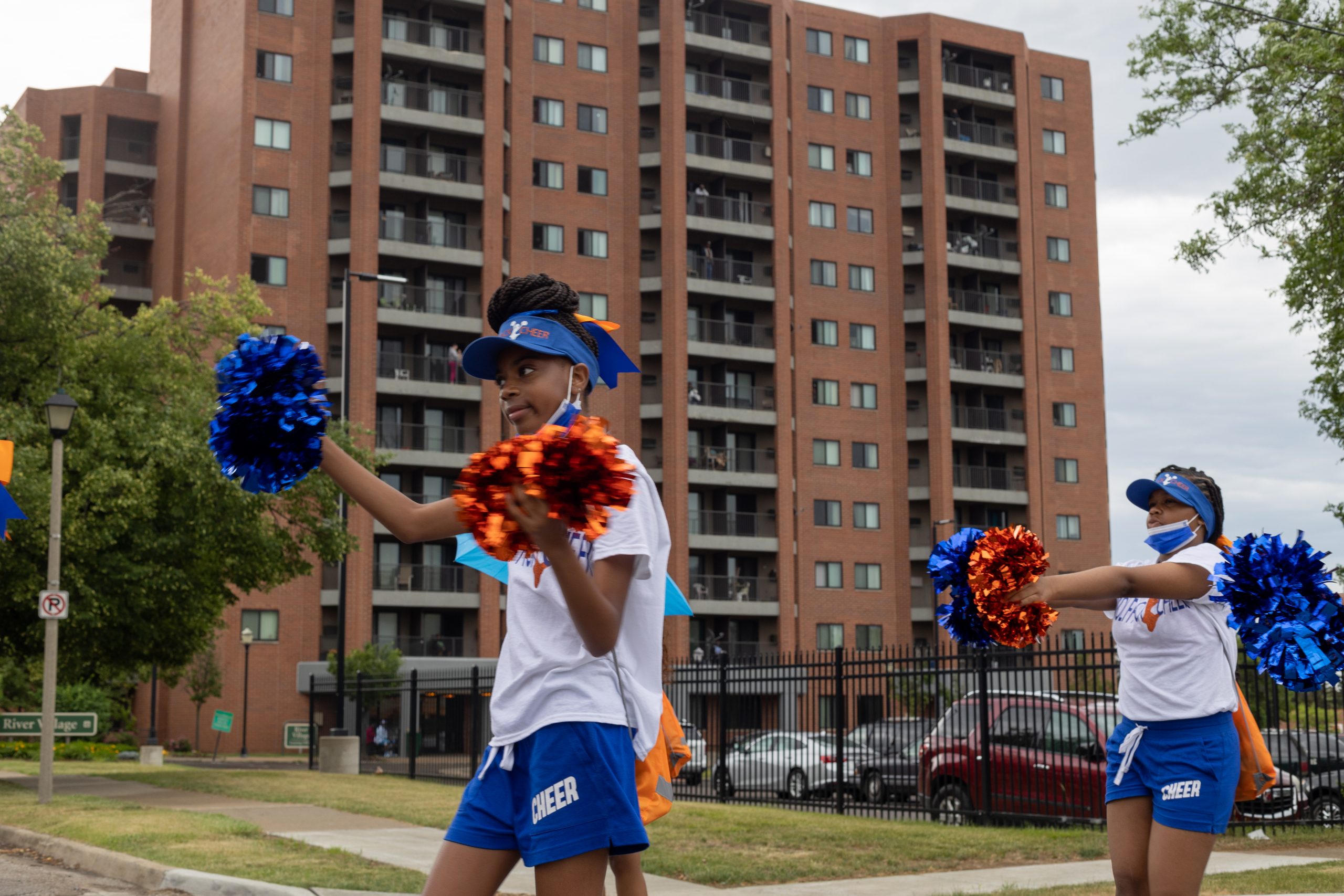 Michael Caldwell, 60, and Sheletta Segrese, 43, both of Flint, hold their puppets outside of Berston Field House on June 19, 2021. Their puppets names are Julio and Angelica. (KT Kanazawich | Flint Beat)The Wolfpack Cheer squad marches in the rain down Saginaw Street in Flint, Mich. during the Champions Parade on June 19, 2021. (KT Kanazawich | Flint Beat)