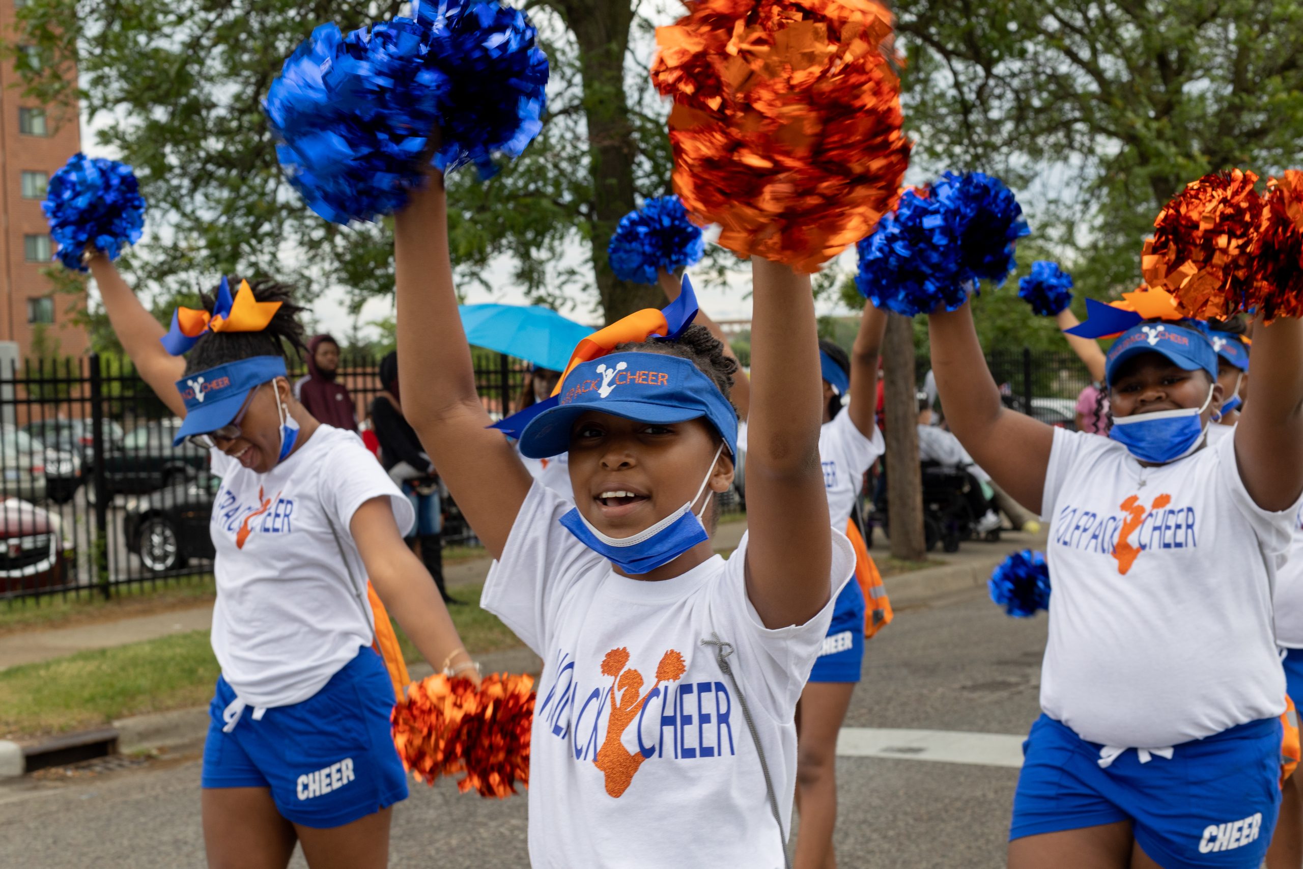 The Wolfpack Cheer squad marches in the rain up N. Saginaw Street in Flint, Mich. during the Champions Parade celebrating Juneteenth on June 19, 2021. (KT Kanazawich | Flint Beat)