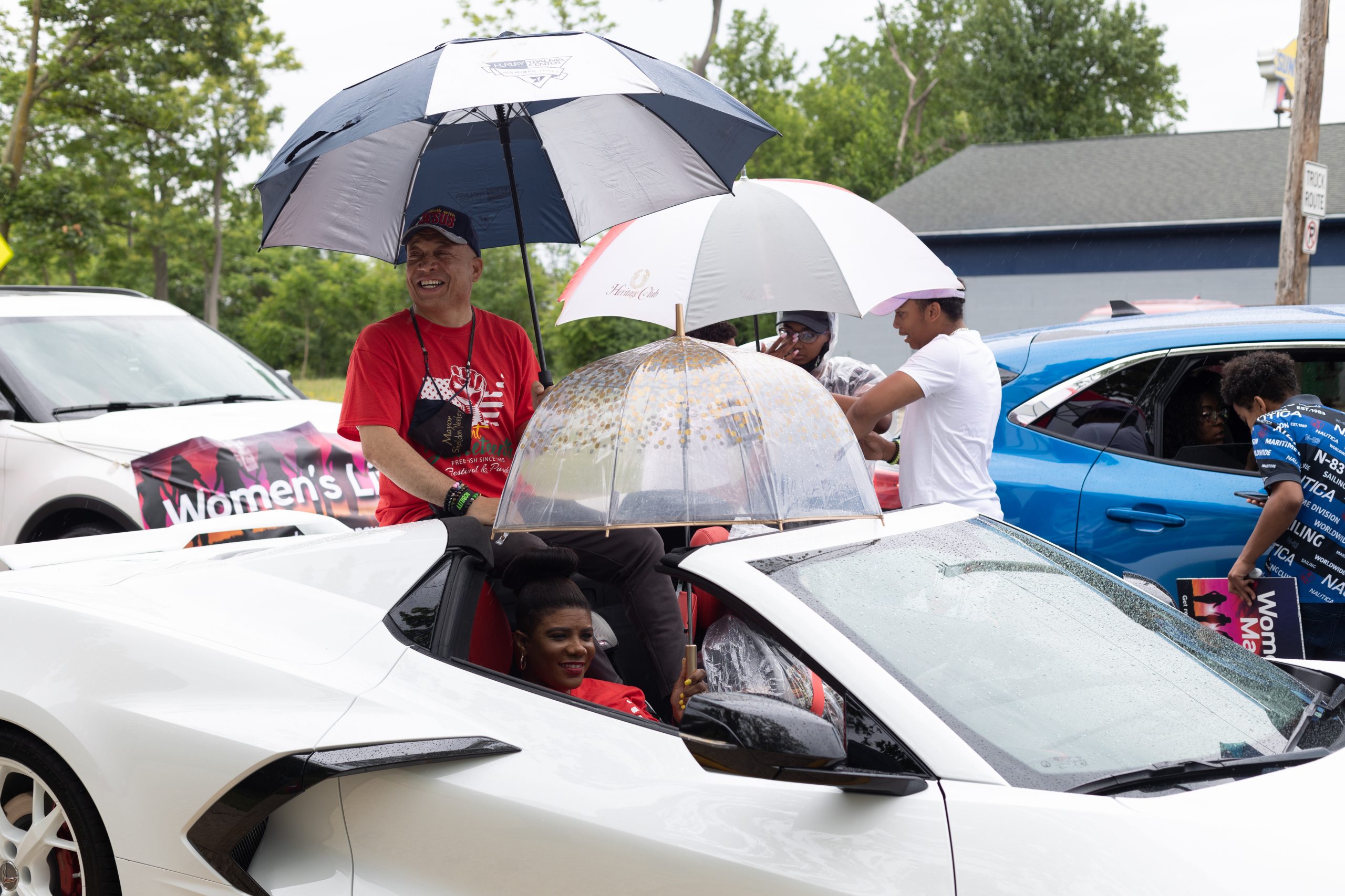 Mayor Sheldon Neeley and his wife State Representative Cynthia Neeley take cover under umbrellas during a rainy afternoon at the Champions Parade celebrating Juneteenth in Flint, Mich. on June 19, 2021. (KT Kanazawich | Flint Beat)