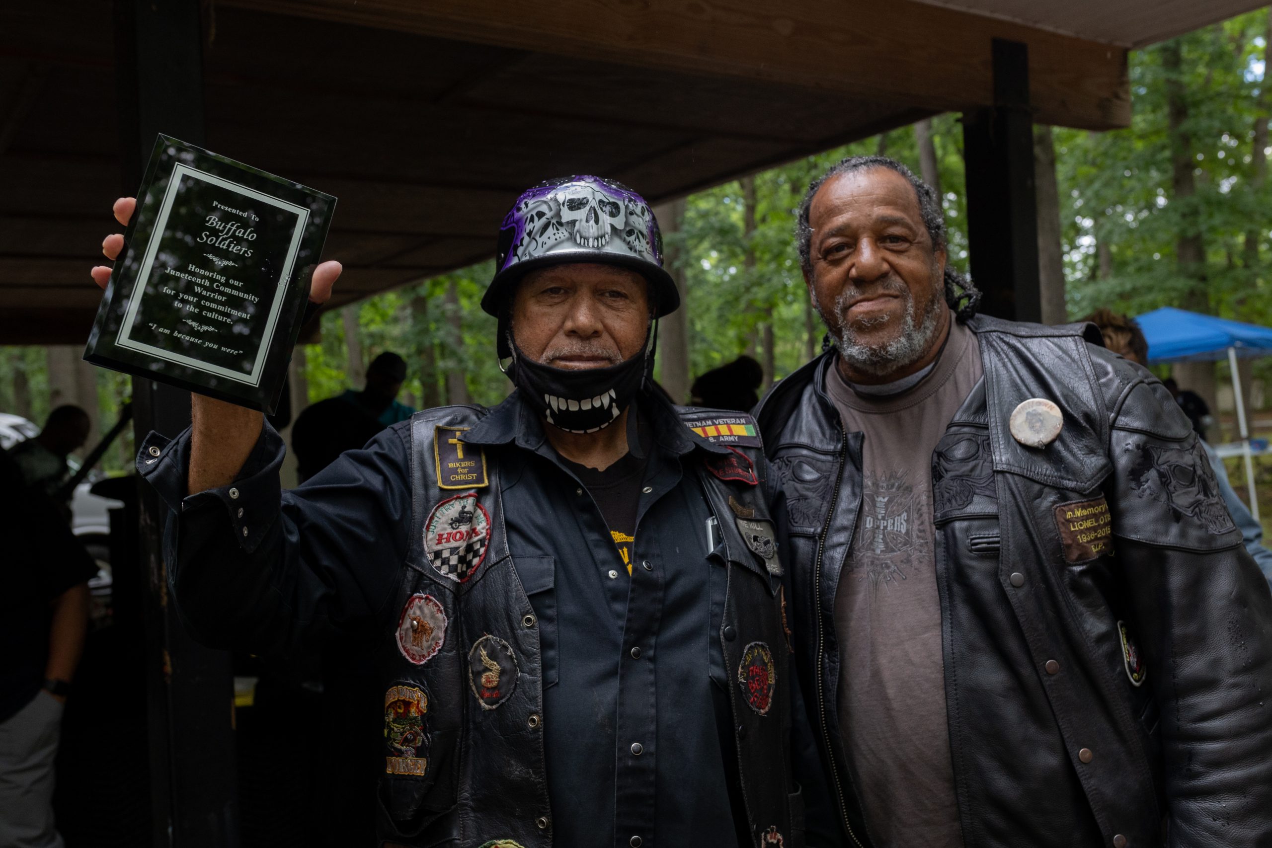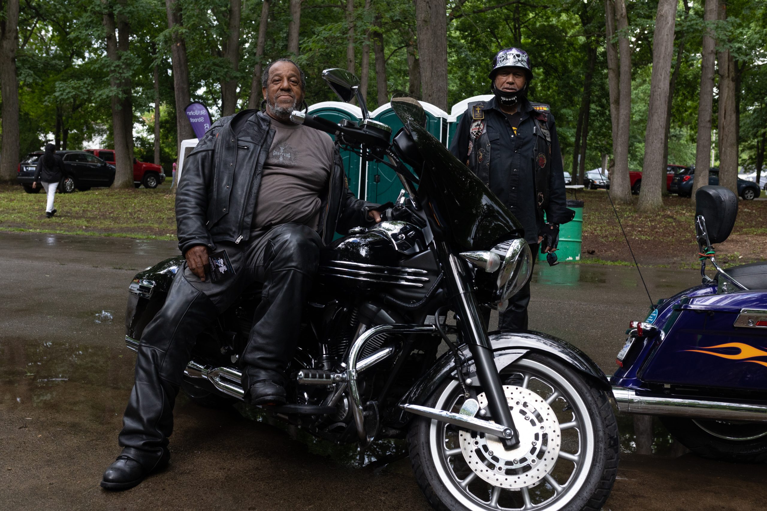 Frank Haralson, 75, and Eugene Williams, 68, both of Flint, are part of the Buffalo Soldiers motorcycle group and were honored at the Traditional Juneteenth Celebration at Max Brandon Park in Flint, Mich. on June 19, 2021 for their commitment to culture. (KT Kanazawich | Flint Beat)