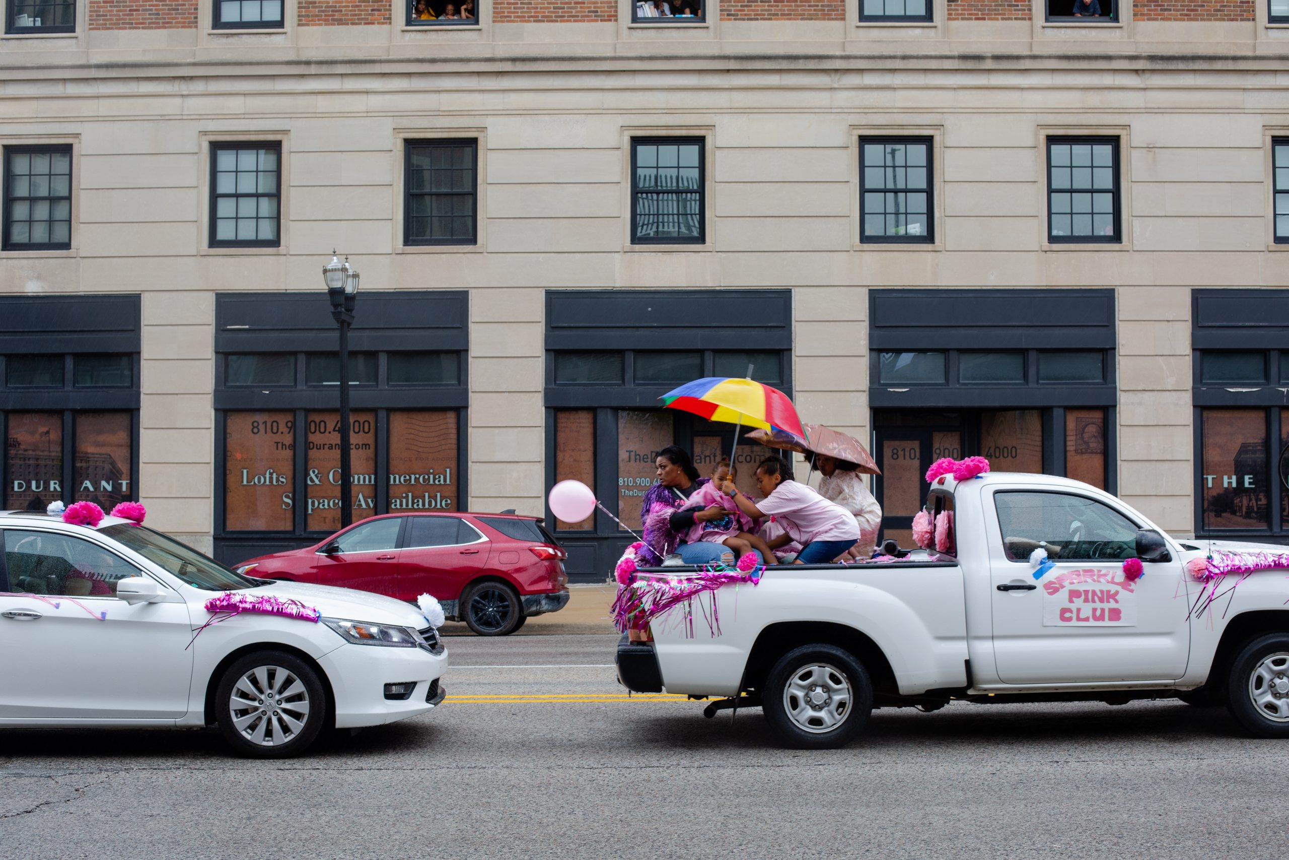 The Sparkle Pink Club for Girls is an empowerment and self-esteem boosting club based in Flint, Mich. Their float was part of the Champions Parade celebrating Juneteenth on June 19, 2021. (KT Kanazawich | Flint Beat)Shirmae Harris, 17, of Flint leads the For The Love of Dance Studio group down Saginaw Street for the Champions Parade celebrating Juneteenth on June 19, 2021. (KT Kanazawich | Flint Beat)