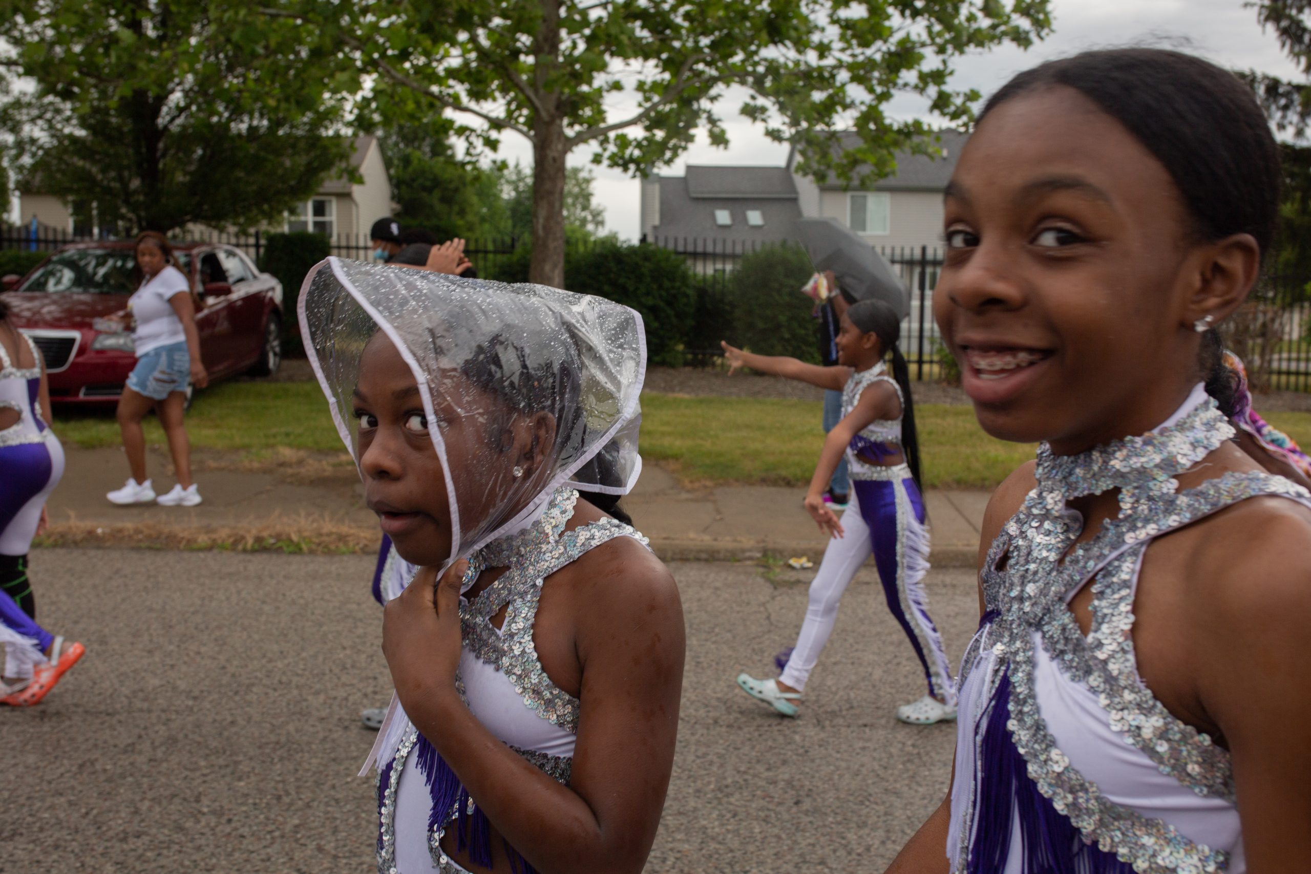 Zaya Jones, 9, covers her hair from the rain as she walks with her team mate Naenae Veal , 13 during the Champions Parade celebrating Juneteenth on June 19, 2021. Both girls dance with the Kamazing Angels Dance Factory. (KT Kanazawich | Flint Beat)