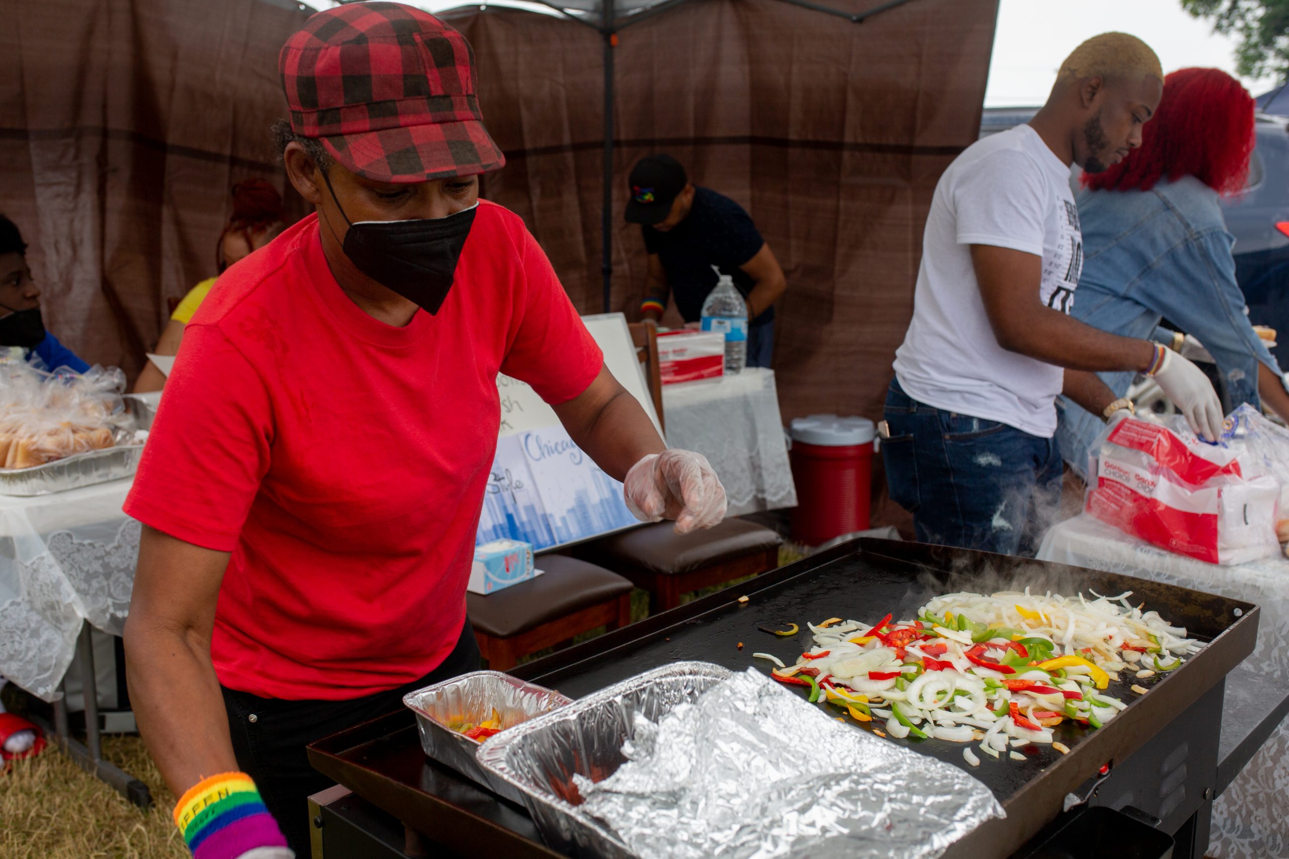 The True Grill workers cook up polish sausages in their tent at the Black Wall Street Juneteenth event at Berston Field House in Flint, Mich. on June 19, 2021. (KT Kanazawich | Flint Beat)