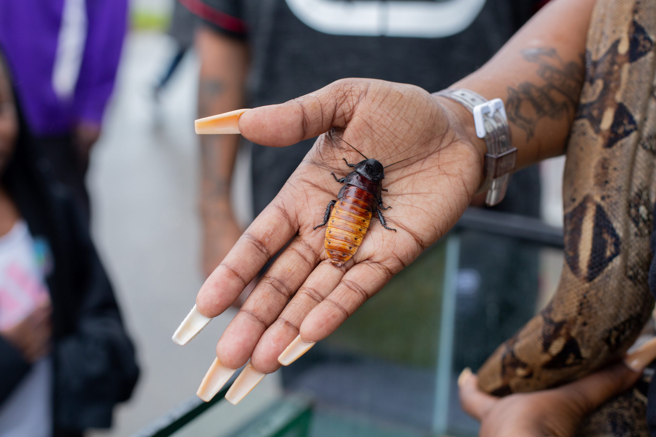 Zoologist Shekinah Wagner Lee shows off a Madagascar Hissing Cockroach during the Black Wall Street Juneteenth event on June 19, 2021. (KT Kanazawich | Flint Beat)