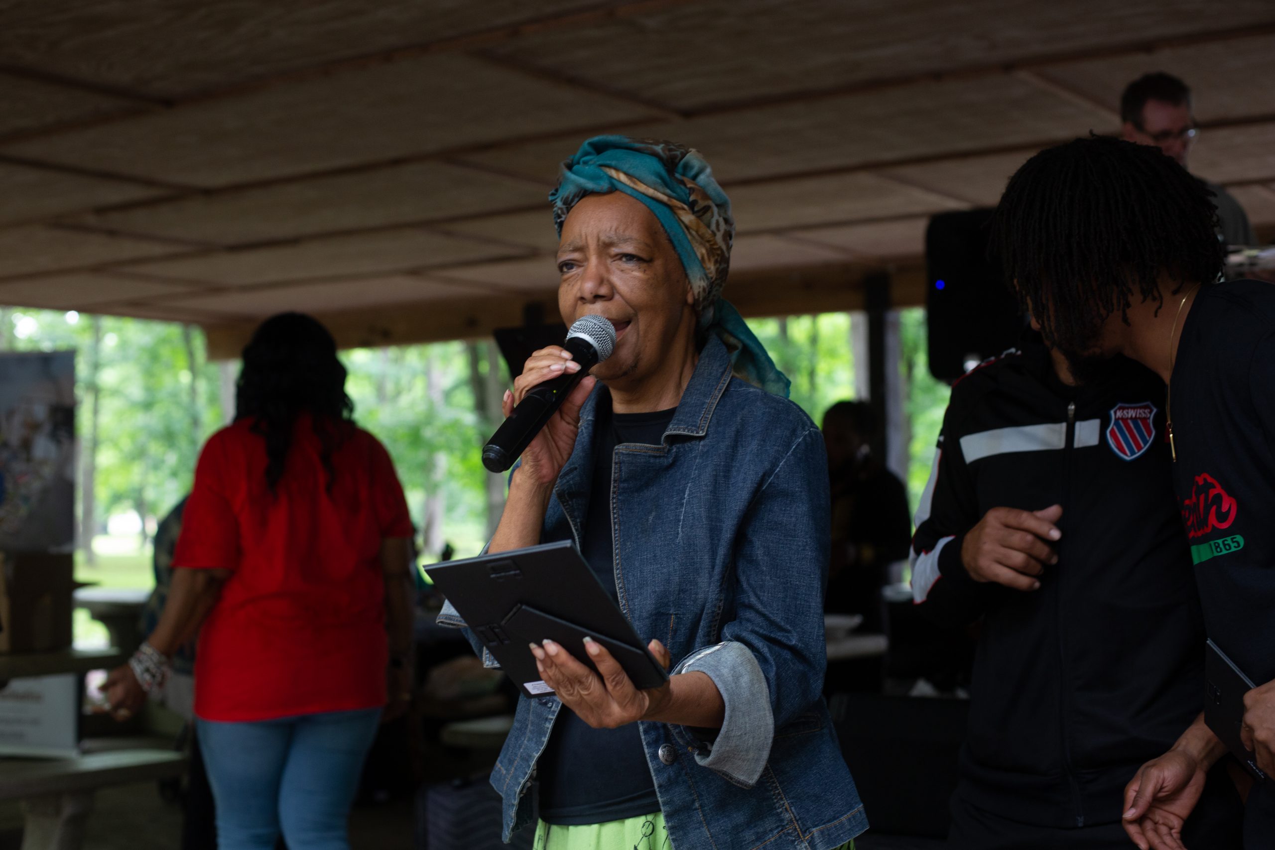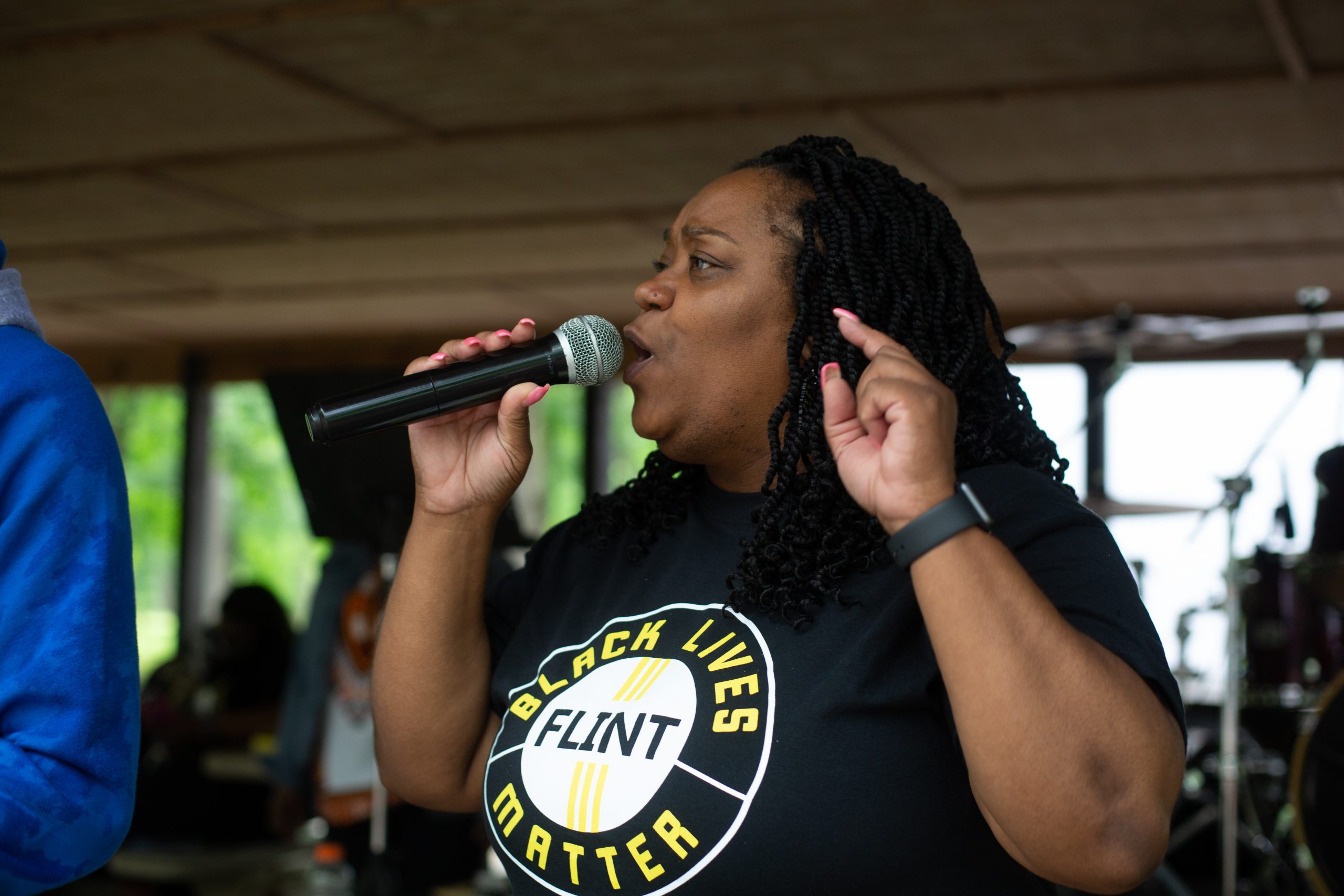 Water Warrior Claire McClinton speaks at the Traditional Juneteenth Celebration at Max Brandon Park in Flint, Mich. on June 19, 2021. (KT Kanazawich | Flint Beat)