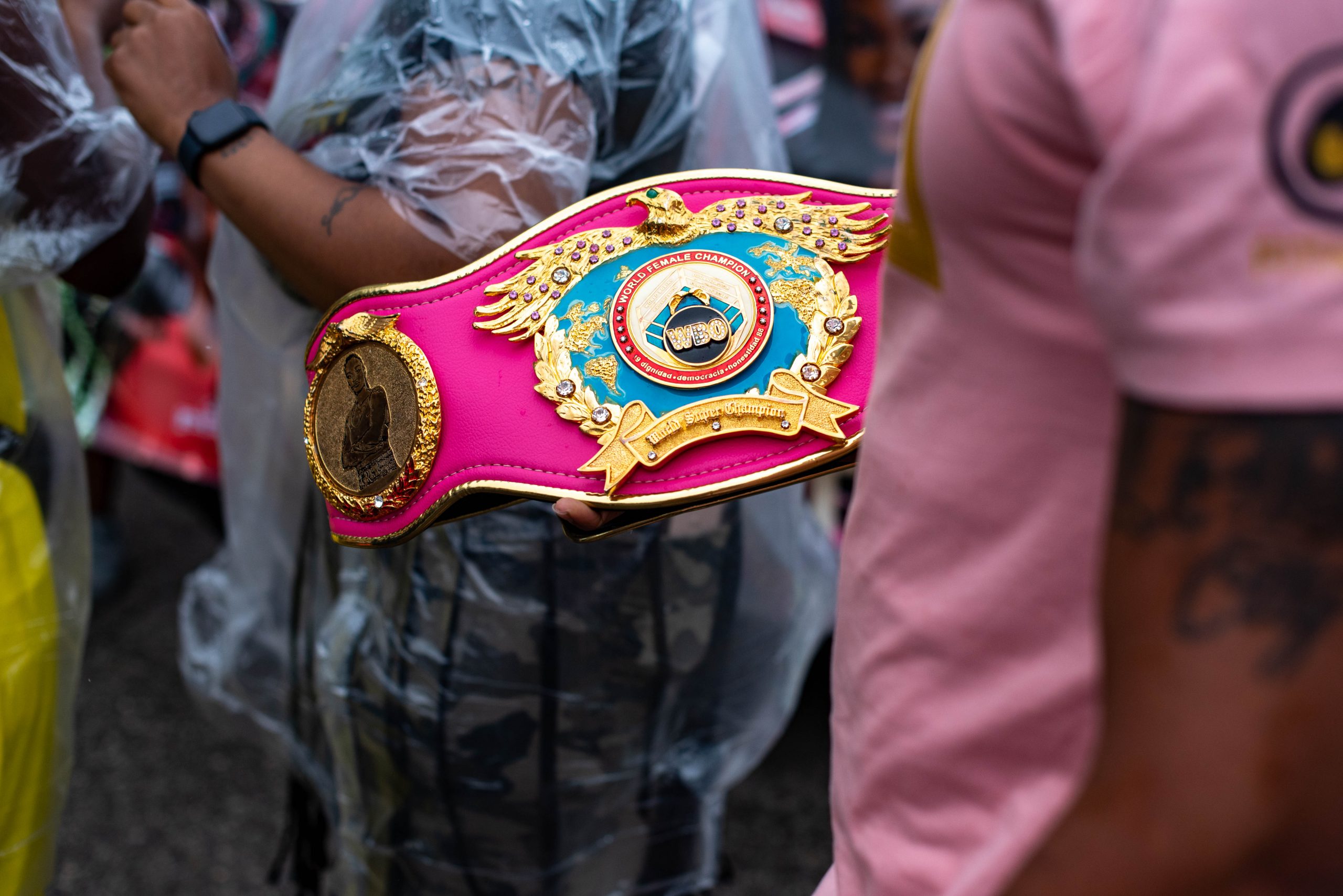 One of Claressa Shields’ Championship belts leaves with her as she exits a car and prepares to lead the Champions Parade in Flint on Saturday, June 19. (Santiago Ochoa | Flint Beat)